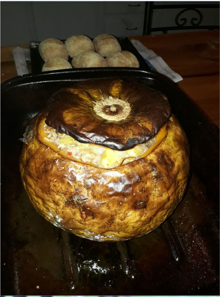 So I got one, hollowed out the seeds, stuffed it with beef, spud, onion, celery, brown rice, a chopped tomato, diced chilli, beef stock, a splash of olive oil, and a little salt and pepper.