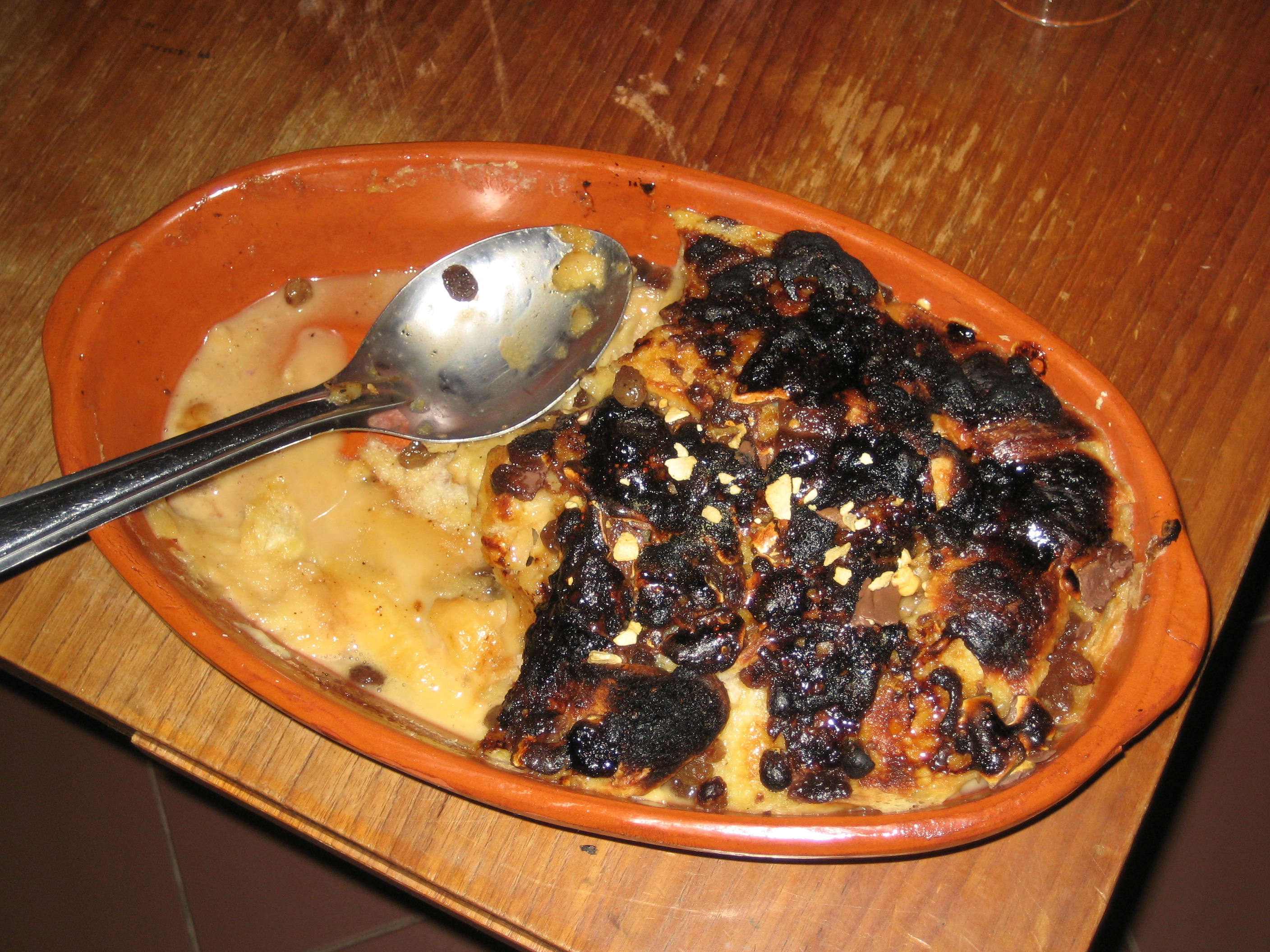 I then followed up with a banana bread & butter pudding for dessert. I overbrowned it a bit, but it was delicious and never tasted burnt at all, despite its blacktopped look. It was an interesting recipe which used sliced croissants instead of bread.