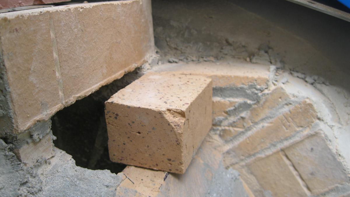 For the last brick below the flue base, I beveled the last full brick in the arch to create a sort of ledge. This allows the filler brick to lay at a right angle, and tuck under the flue base to transfer some of the flue weight into the middle of the vent brick.