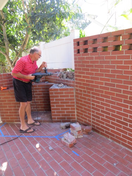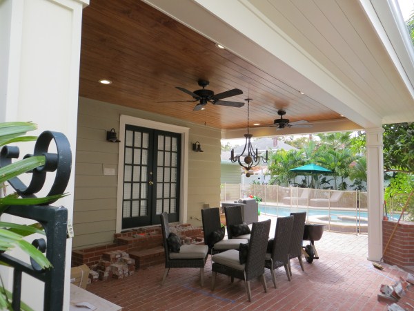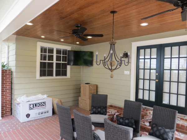 Knocked down the small brick wall in front to open up the space and had a roof built. We opted for stained pine on the inside ceiling. TV up in the corner and a table will arrive in Feb to go under the chandelier. No, I did not do this work. Waaaaaaaaayyy beyond my scope. This project just wrapped up a couple weeks ago so now it's on to phase 2......the wood fired oven and outdoor kitchen.