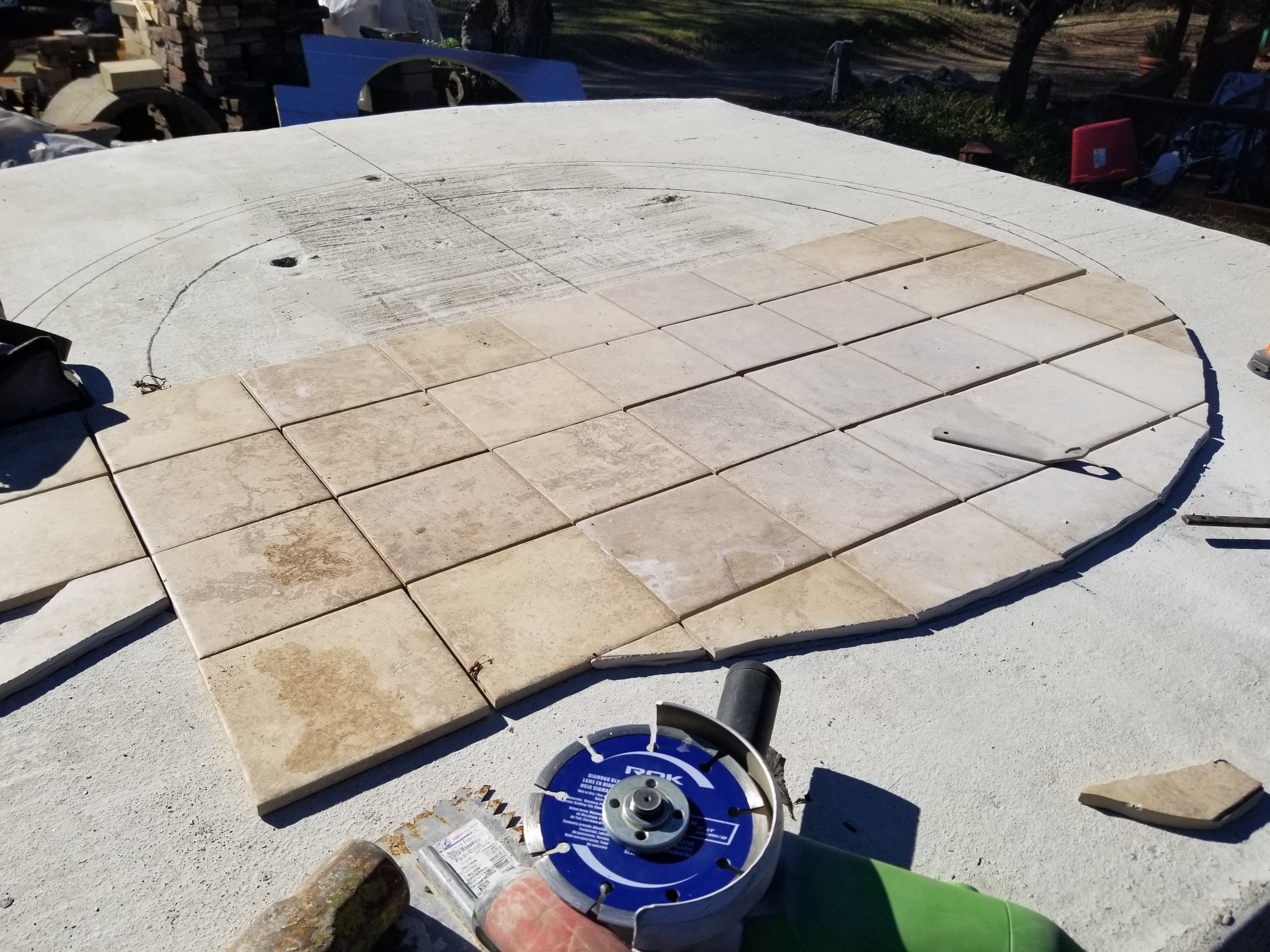 Looks like a great start Chris. I would suggest placing your perlcrete sections on top of the tile and the CFI between the cooking floor bricks and the perlcrete. The CFI offers much better insulation value per inch and your perlcrete sections will be the secondary layer to retain any heat passing through the CFI. Do make sure to align the spaces between the tiles to your holes in the slab. I assume you are going to be cutting those full length bricks laid out as the dome base in your picture so they are all the basic half-brick length.