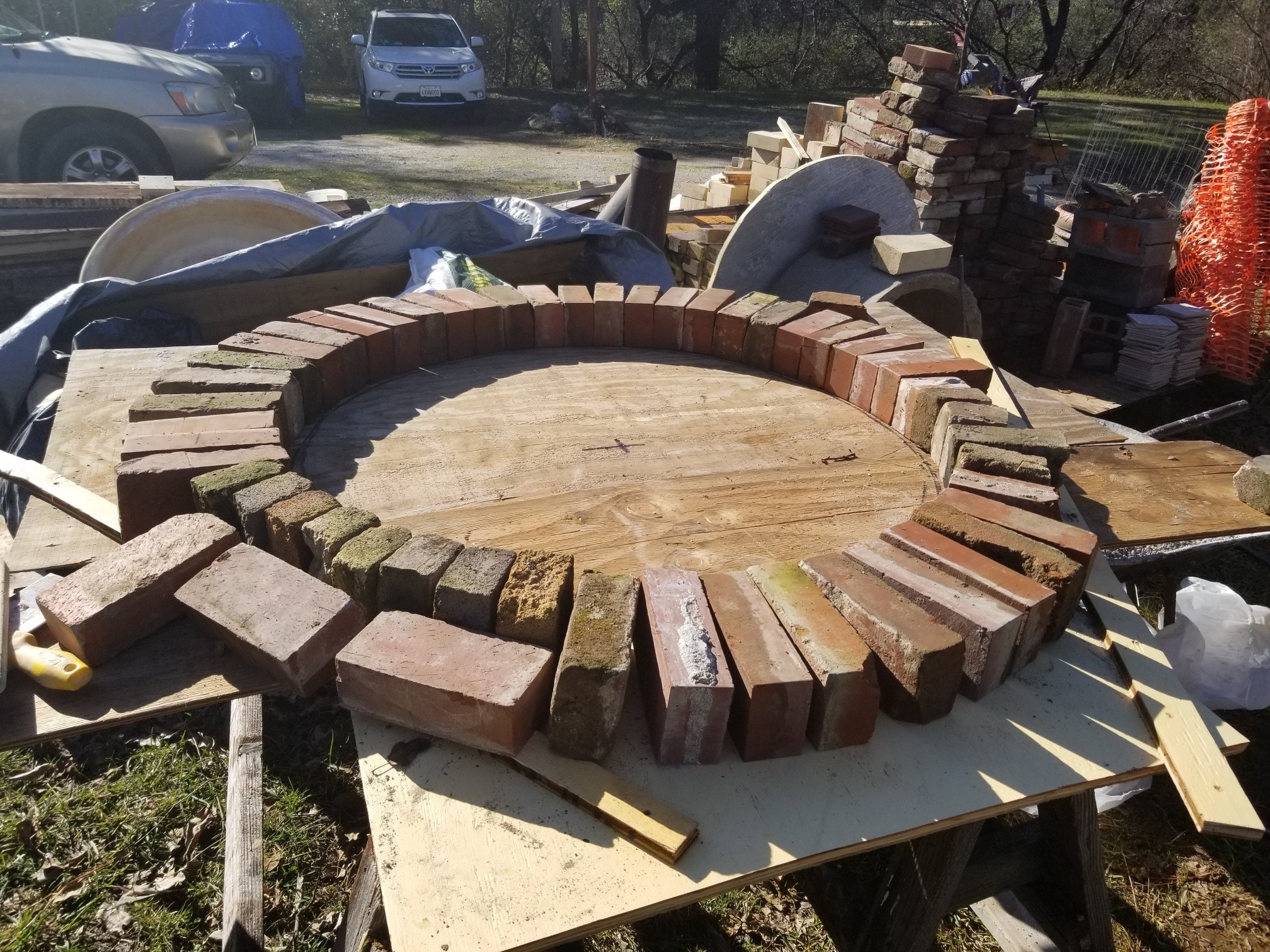 The photo of bricks laid out, might be the non FB bricks I laid to mold the perlite 4" insulation in advance. It was a fast and effective mold.
