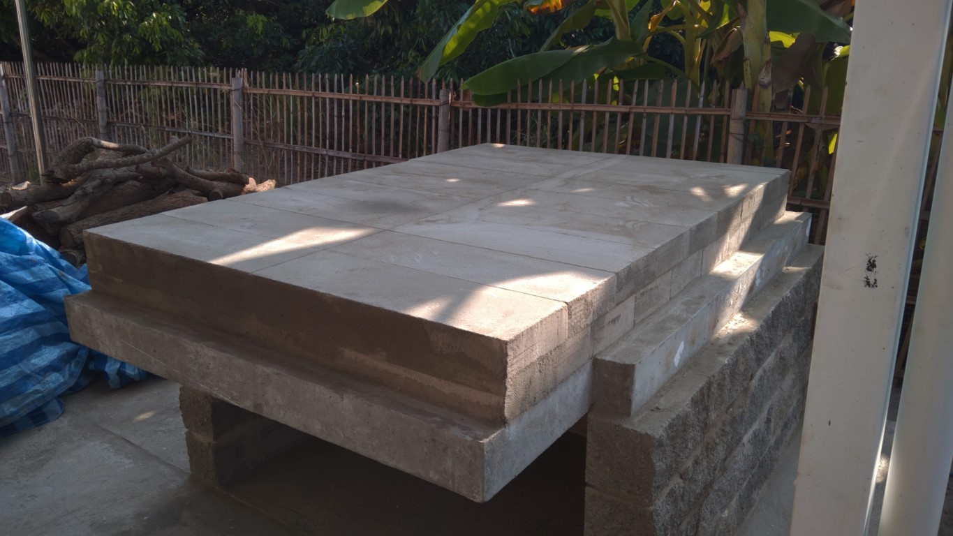 Actually, if you look closely there is a 12cm slab, followed by 14cm (two 7cm layers) of highly insulating AAC (Aerated Aotoclaved Concrete) blocks to provide a very high level of sub-hearth insulation. The few red clay blocks you see on their side across the front are there just to fill in a gap and aren't beneath the hearth - you can see the AAC blocks down the sides. :-) I've attached a clearer shot here too.