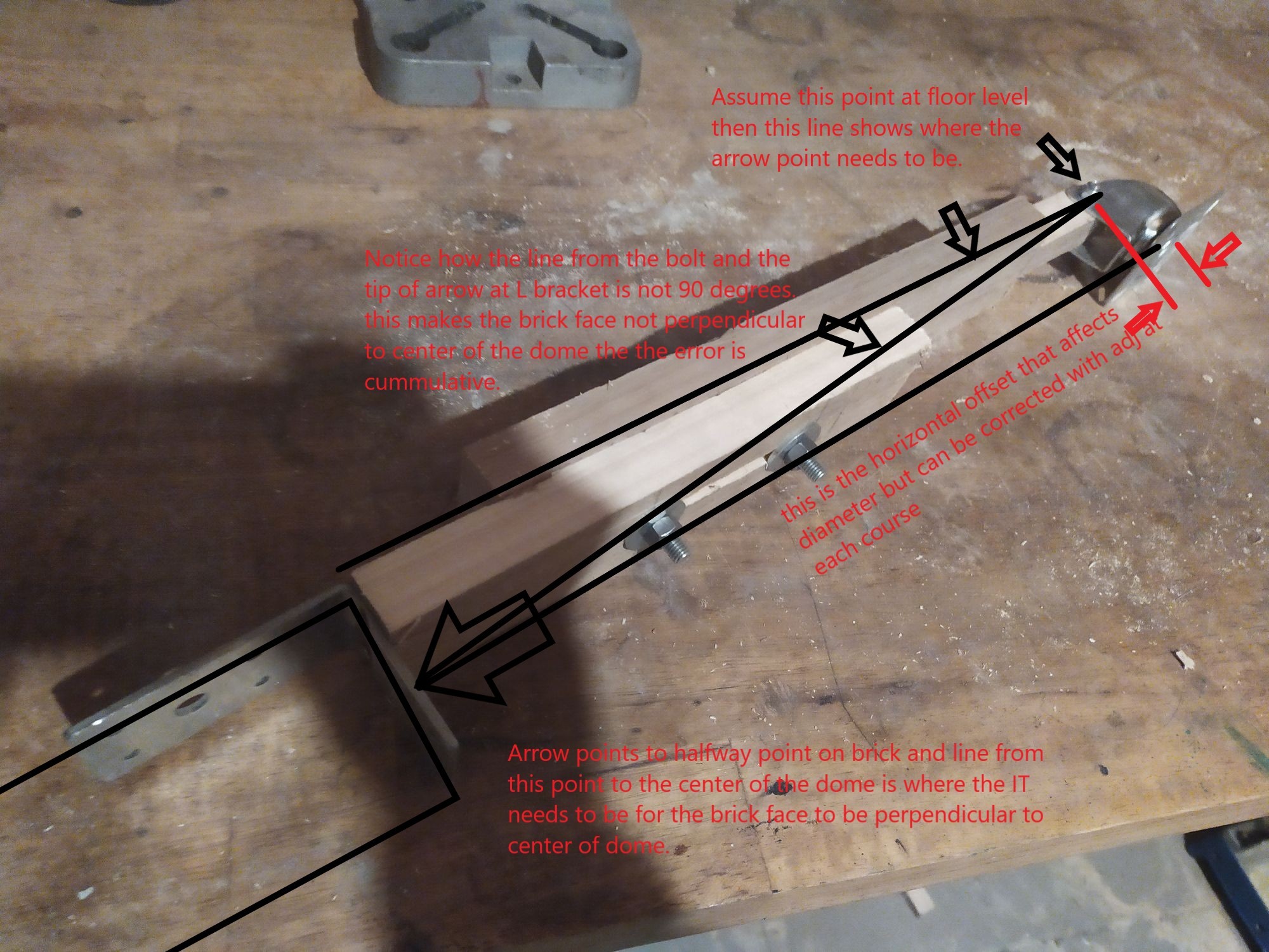Okay there are three issues to solve. First, vertical offset of the pivot point, this is where you bolted the adjustable wood arm to the metal swivel caster. This will be corrected if as you say lower the bolted point to floor level. Second, the bolted pivot point is not at the center point of the swivel caster but horizontal offset. So at the bottom of the dome say it is 36" diameter, at the top of the dome it will be different (by offset). This can be corrected as you move up in course by your adjustable IT, you just need to be aware of these dimension changes, This comes into play if you do a tapered inner arch. Lastly, from the center point of the swivel (not the bolted part) along the adjustable wood pieces, the line needs to intersect at the halfway point on the brick at the L bracket or you bricks will NOT be perpendicular to the center of the dome, this error is cumulative at each course so it gets worse as you go up and you see the brick faces not matching the previous row.