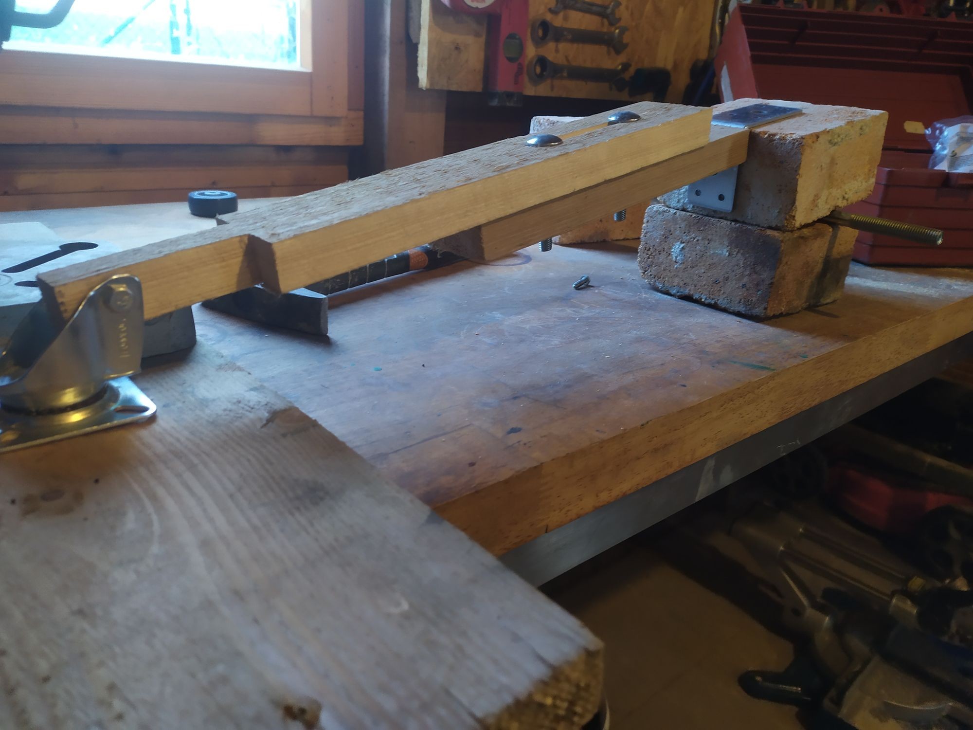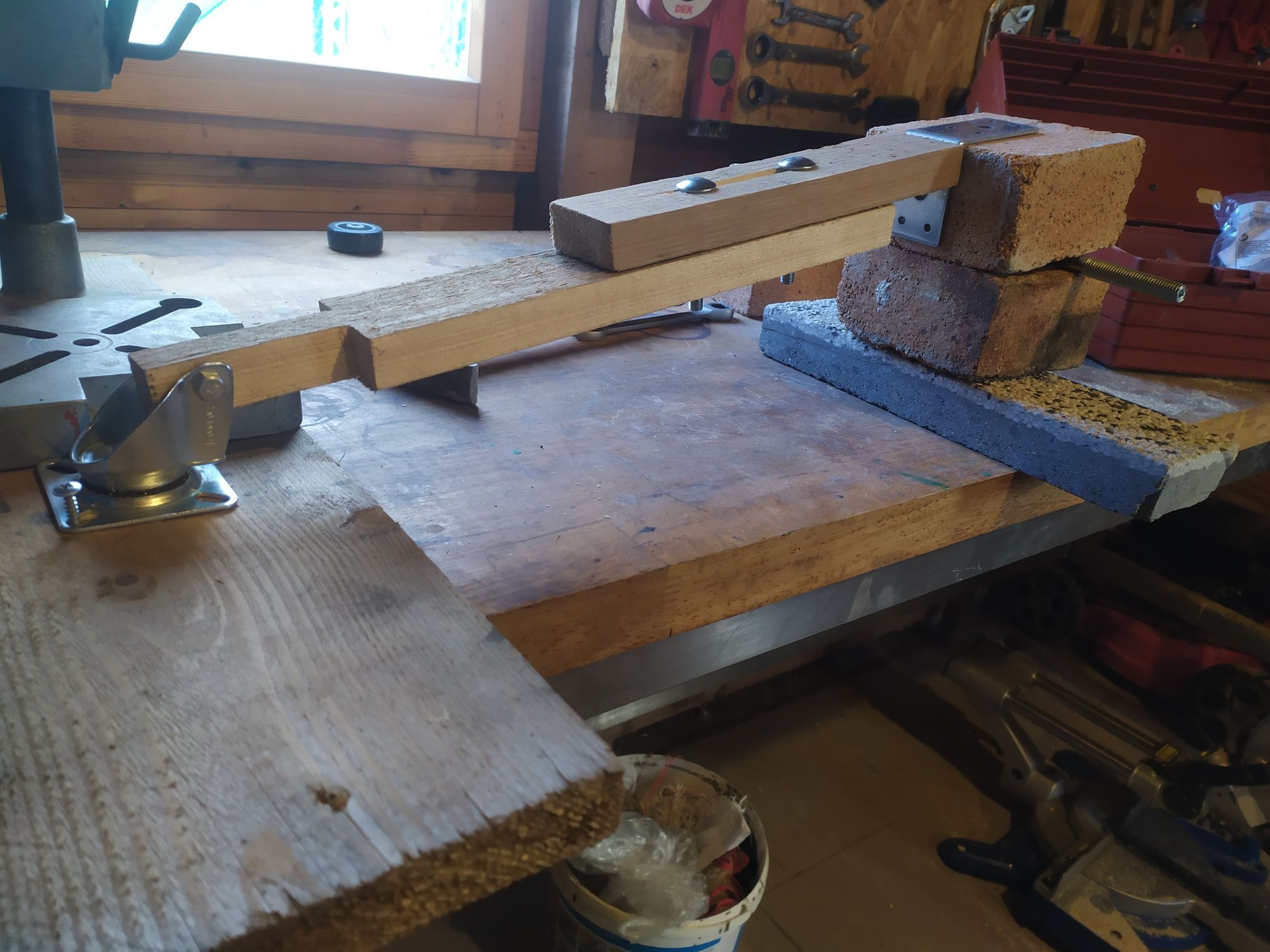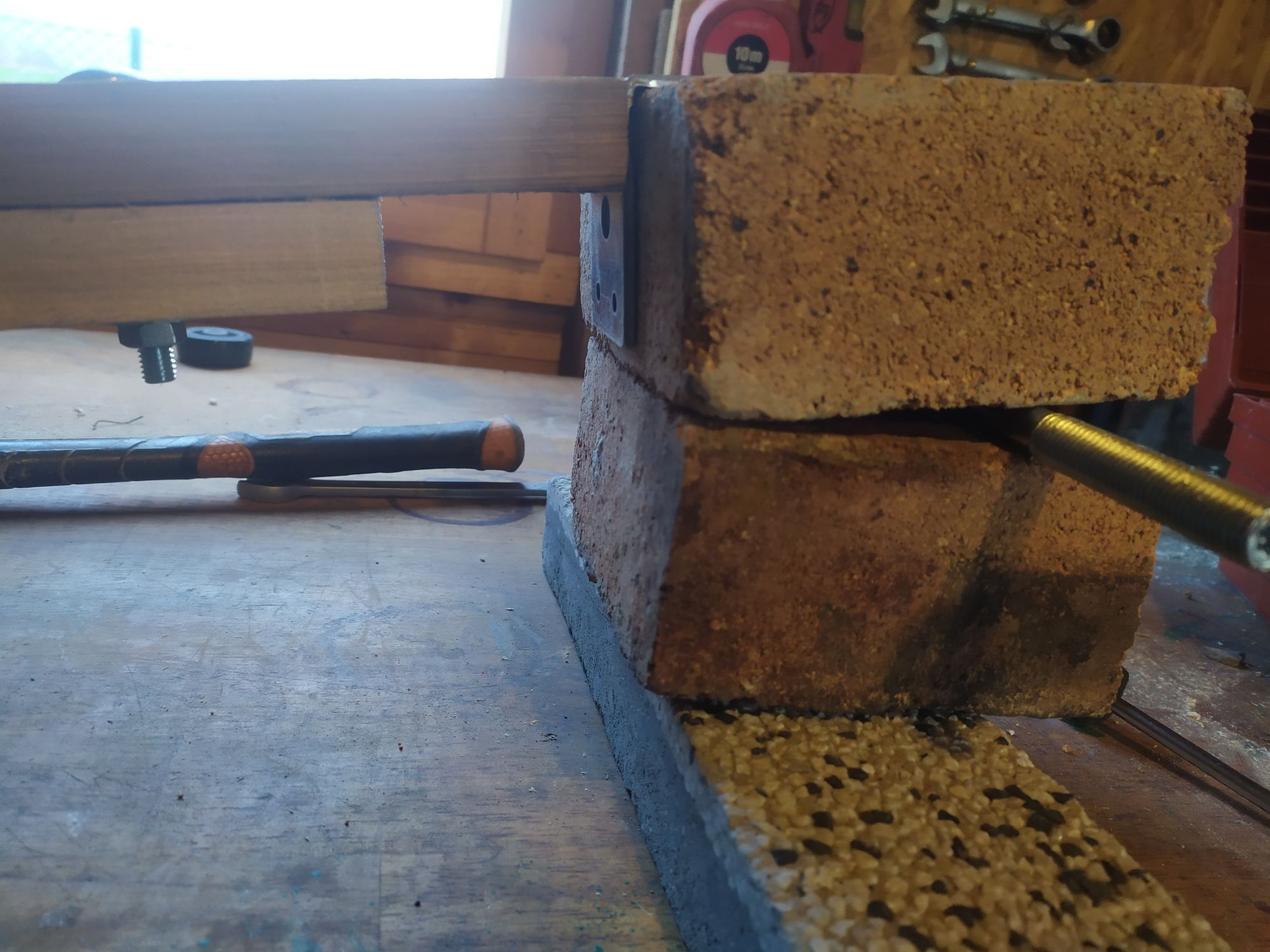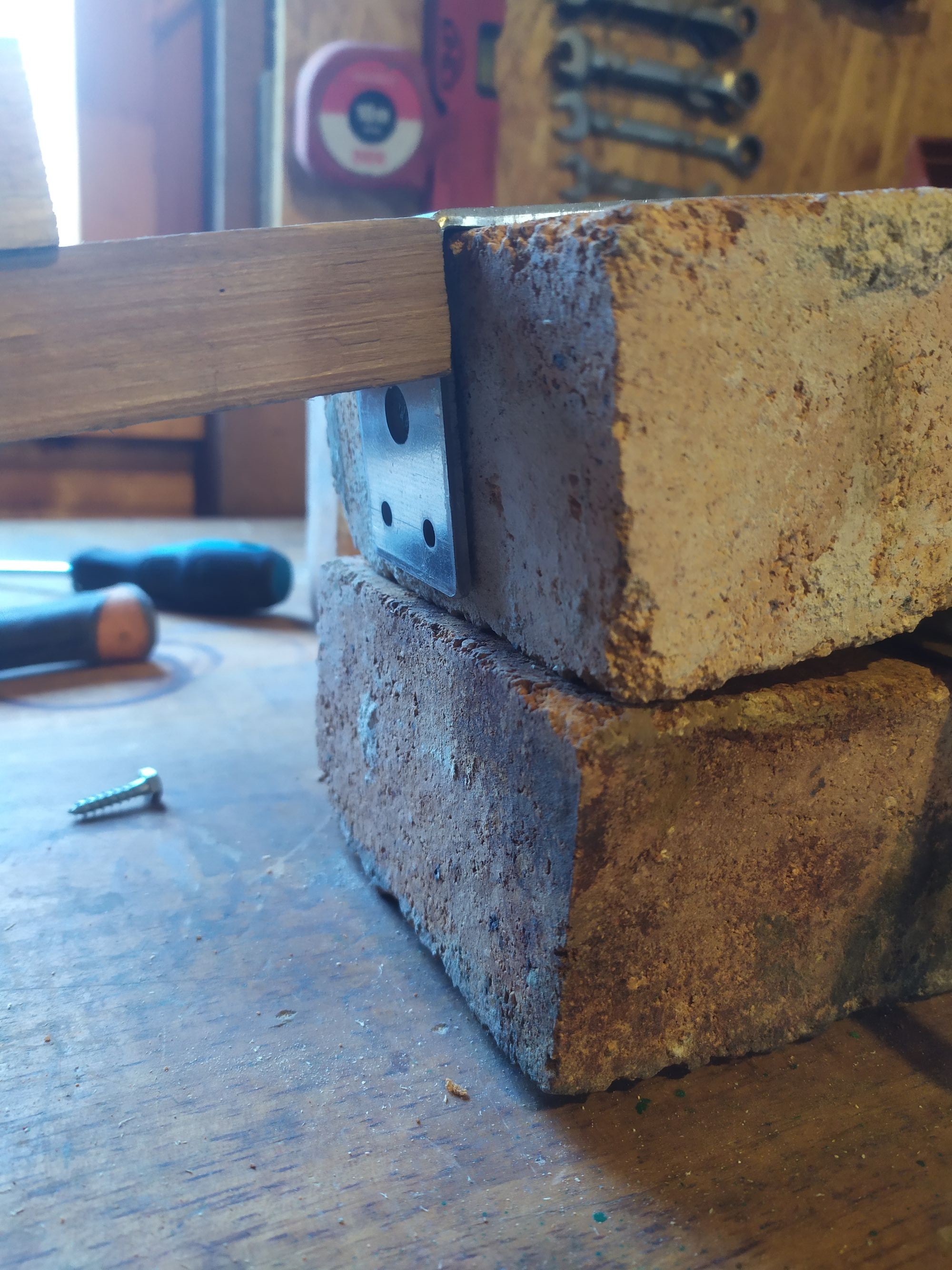 "Second, this one is critical. The line from the center point on the floor and the "L" bracket "must " intersect the midway point on the brick, IE if the bricks are 50mm thick then the intersection point needs to be at 25mm. the way the L bracket is currently mounted to the wood appears to be too high."