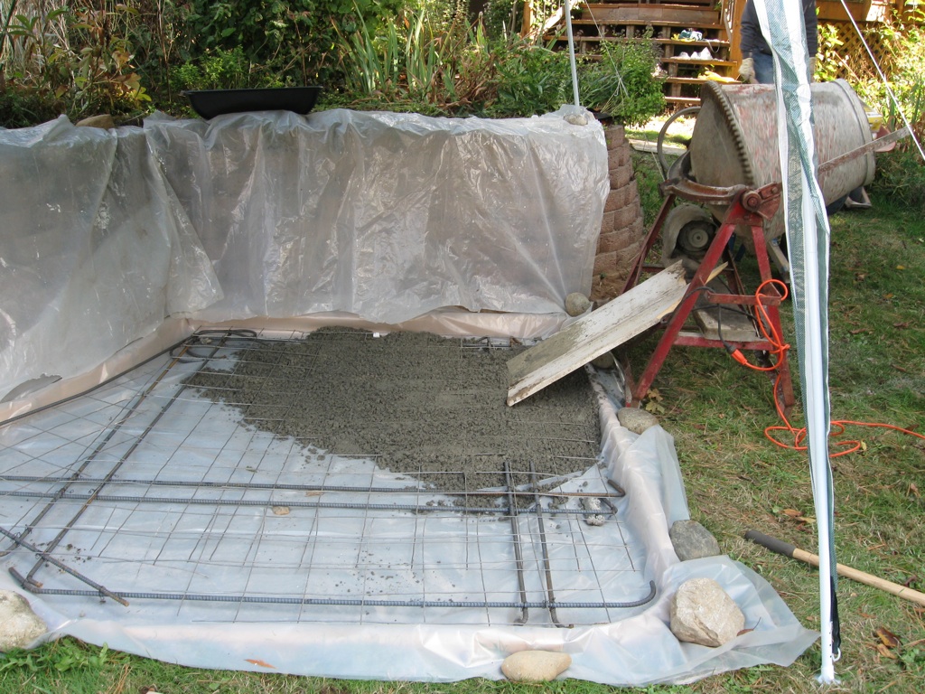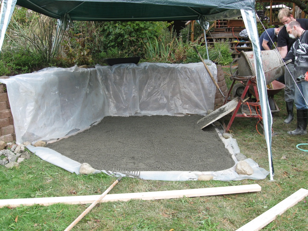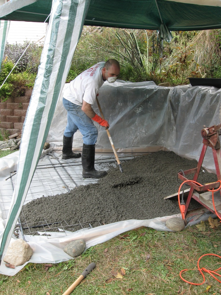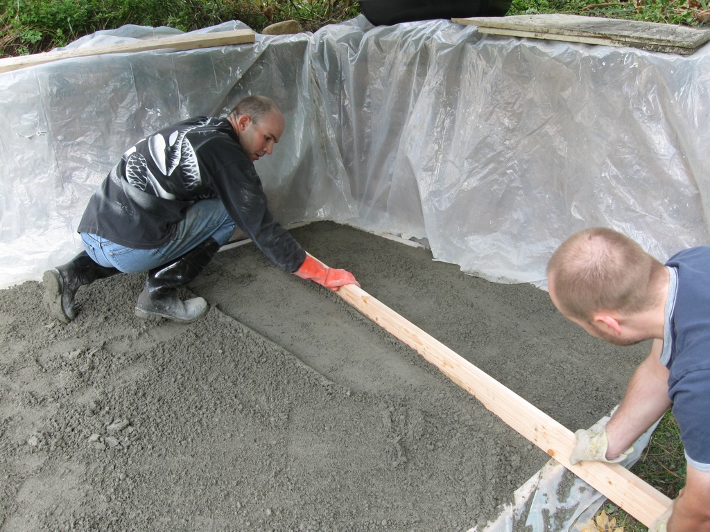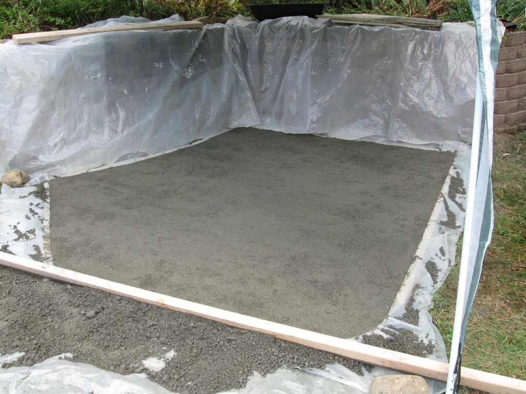 Bottom line, I think I made the concrete a tad bit on the dry side...and if one were interested in aesthetics (I'm not w.r.t. the foundation since it will all be covered eventually anyway), floating it probably would have helped. I didn't float it because I couldn't imagine what floating would do...which in turn resulted from the dry texture I got in the first place: I just couldn't see how swirling a little toy plank around that dry crud would have done anything. If it had been wetter to begin with, it would have both reduced surface crumbling and motivated me to float by permitting me to believe such an endeavor could have a tangible effect.