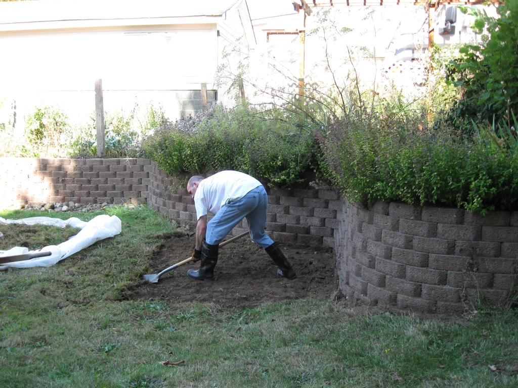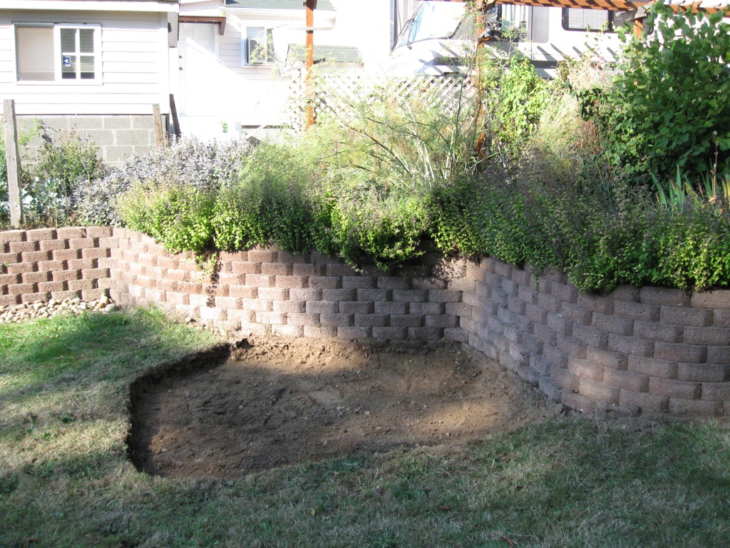 It begins! It's hard to appreciate from a picture of a hole in the ground just how much effort goes into making such a hole. I haven't leveled it yet, and I suspect I may need to go a little deeper anyway (3" gravel + 5" concrete = 8" foundation, let concrete rise above lawn by about 2" means I need 6" deep level across the bottom).