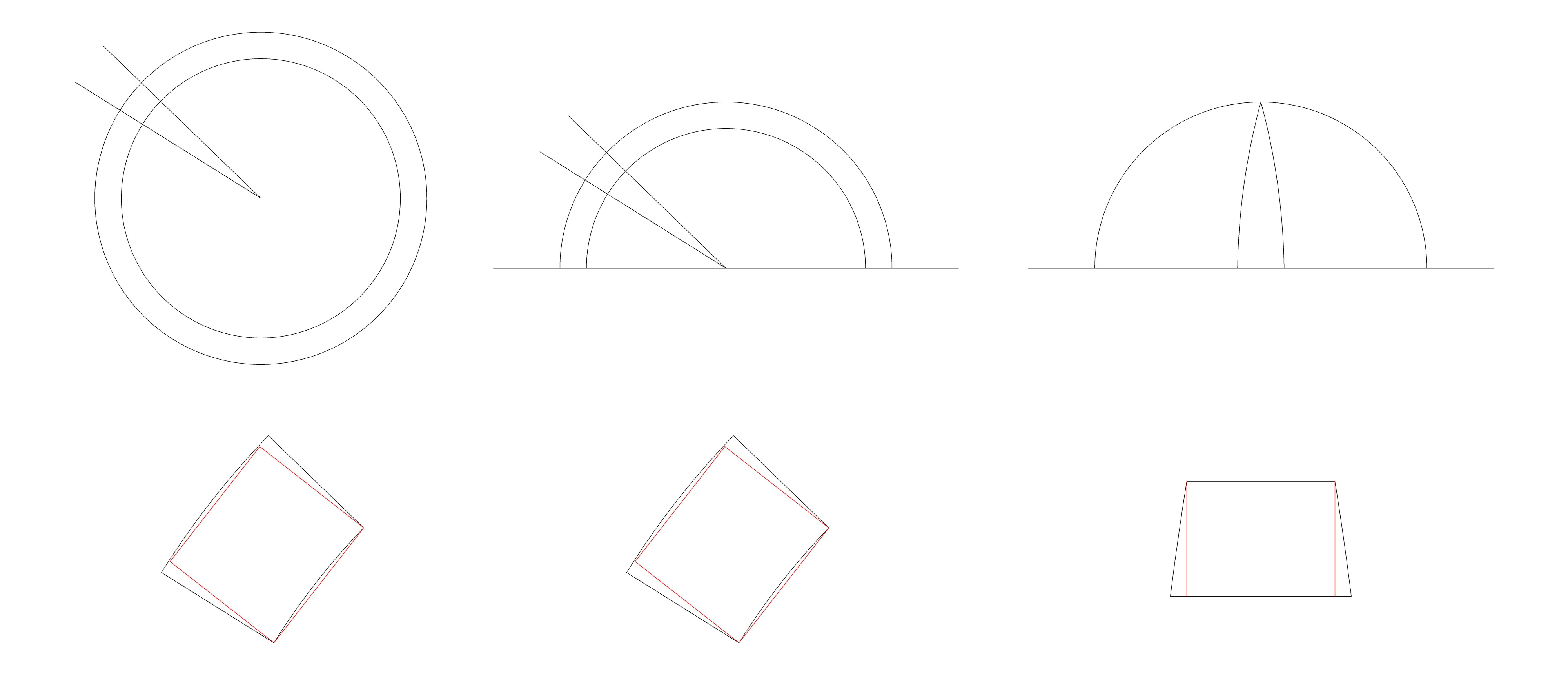 It might help to visualise the problem, though, if you picture a globe with the lines of latitude and longitude – they define (non-rectangular) sections that are just like those one needs to cut from brick to make a dome. The lines of longitude narrow as you proceed from the equator up (or down) the globe. To fit tightly a brick must have the vertical faces cut at the correct angle – just like lines of longitude. This angle becomes steeper as you approach the top, so you may get away without cutting the first few courses. If you use rectangular brick sections to approximate this shape, there will be a wedge shaped void that gets larger as you proceed.