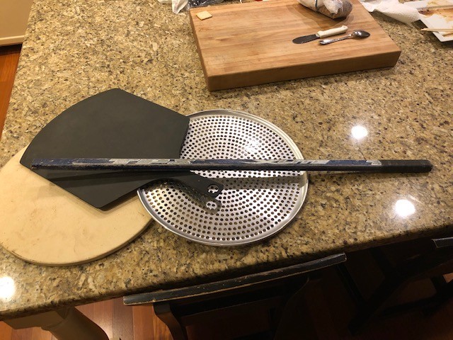 In the picture, .. ignore the metal aluminum 'carrier' pan, as well as the hockey stick that I cut off the blade (so I can duct tape this hockey stick to the short peel and make a crude long shafted peel)....