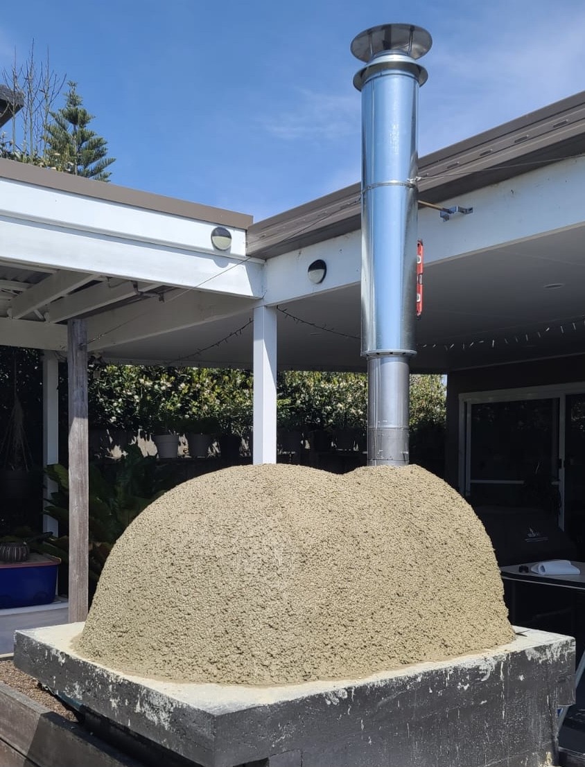 When rendering it is advised to dampen the substrate to reduce the suction of water from the wet render mix. Unfortunately because the vermicrete is so water absorbent it will disappear very quickly. Having gone to considerable trouble to drive out the water, why re-wet it again. There probably is a case to apply a sealer over the vermictrete layer, but I prefer to do the whole render layer in one go about 12-15 mm thick and then wet sponge the surface to remove any tooling marks and then immediately cover the whole oven with cling wrap so all the moisture is sealed in the outer rendered layer. The next day little beads of moisture can be seen under the cling wrap indicating there's plenty of moisture in the rendered layer. As the strength can be considerably enhanced if kept moist for a week, I leave the oven in this state for a week before unwrapping it.