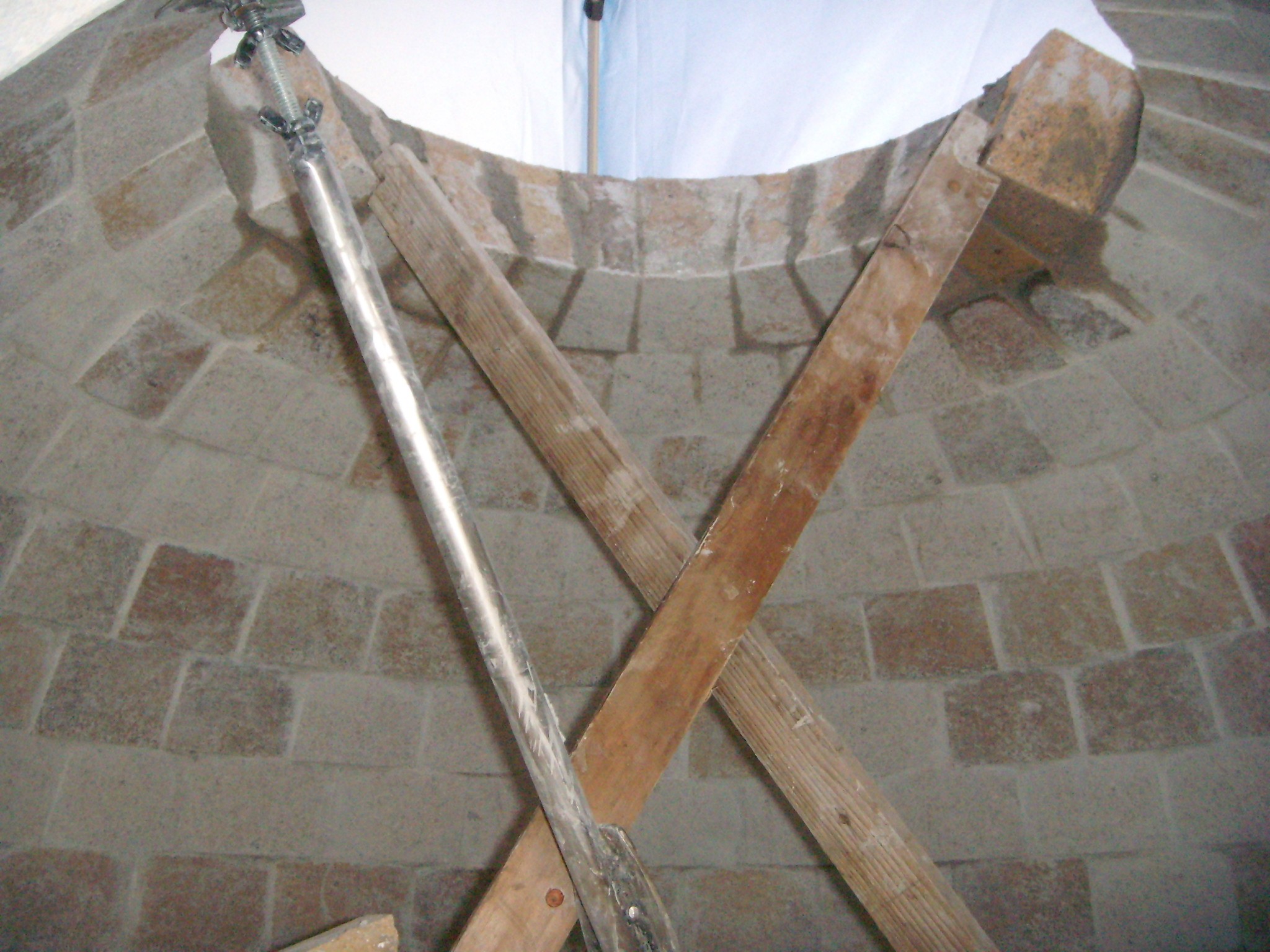 FYI, If you go this route, you will not be able to observe or correct the mortar joints in the inside, you will either see gaps or excess from the and the mortar will have set up by time you can do a visual. IMHO, it would be better to take time, use notched sticks to hold bricks in place. I originally tried a platform to close the dome but found I could not clean up or inspect the inner dome joints.