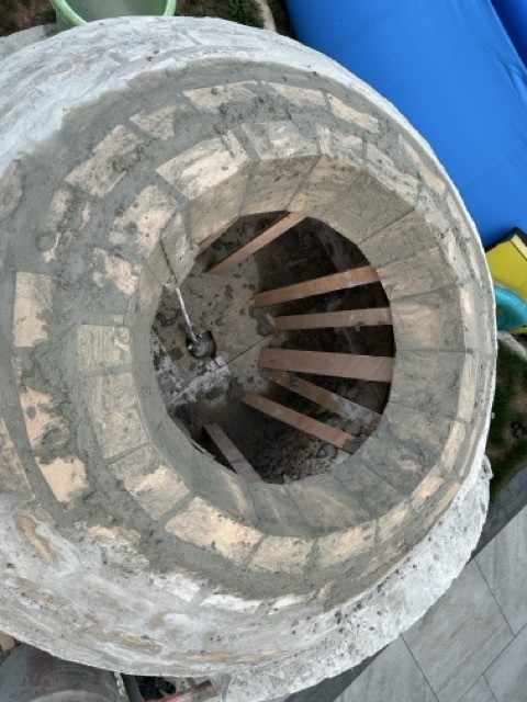I’ll second Russell’s recommendation. For the last two full courses, I ended up cutting each brick to fit tightly into the locations was going to be placed using a combination of my wet saw and an angle grinder. For those two courses I couldn’t fit my IT in there to help place them but found I didn’t need it. The fit of each brick was good enough that the mortar held it in place with any support. That also allowed me to immediately fill gaps and clean up excess mortar from the inside. Mine isn’t perfect but I’m happy with the results.