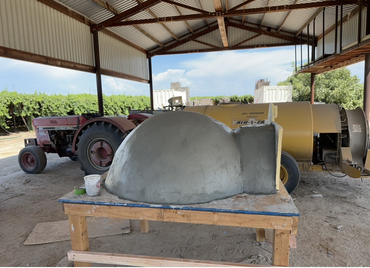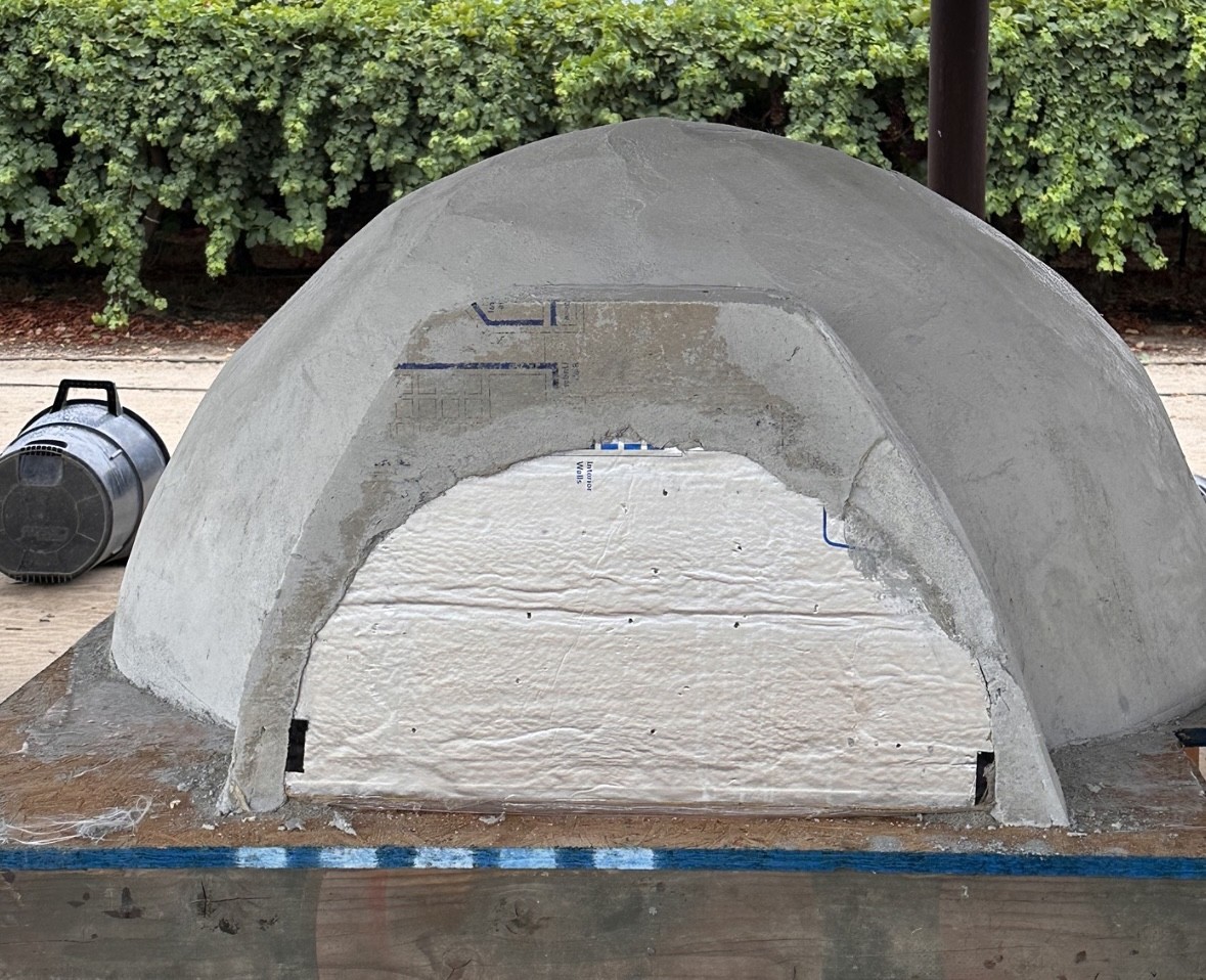 It’s all done! The whole thing was about 250 lbs silica sand 100 lbs Portland cement 50 lbs like and 30 lbs clay. Got a nice 2” inch thick layer around dome and maybe 1.5” gallery. I wrapped the whole thing in a drop cloth for painting and sealed all the edges to prevent moisture from escaping quickly. Im going to mist it a little for the next few days. Where I live it’s in the 100s for the next week so want to make sure it cures slowly.