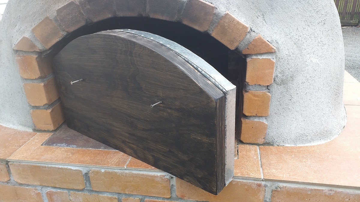 Process: Templated door from arch. Door fits flush against inner arch. I saw no need to make a "stepped" door edge to have the door protrude into the smaller inner arch. I made the steel box first out of 1mm thick stainless steel sheet (for the faces that are seen) and galvanized sheet that I happened to have lying about for the face which is screwed to the back of the timber door. I made the steel door "box" first and test fitted that before filling the "box" with the insulation. Next, I made the timber door and test fitted that too. After that, I screwed the box outside face and sides to the timber door face and after that I filled the box with the insulation materials, namely the furnace insulating brick and furnace blanket. The last step was to pop rivet on the inside stainless steel door face.