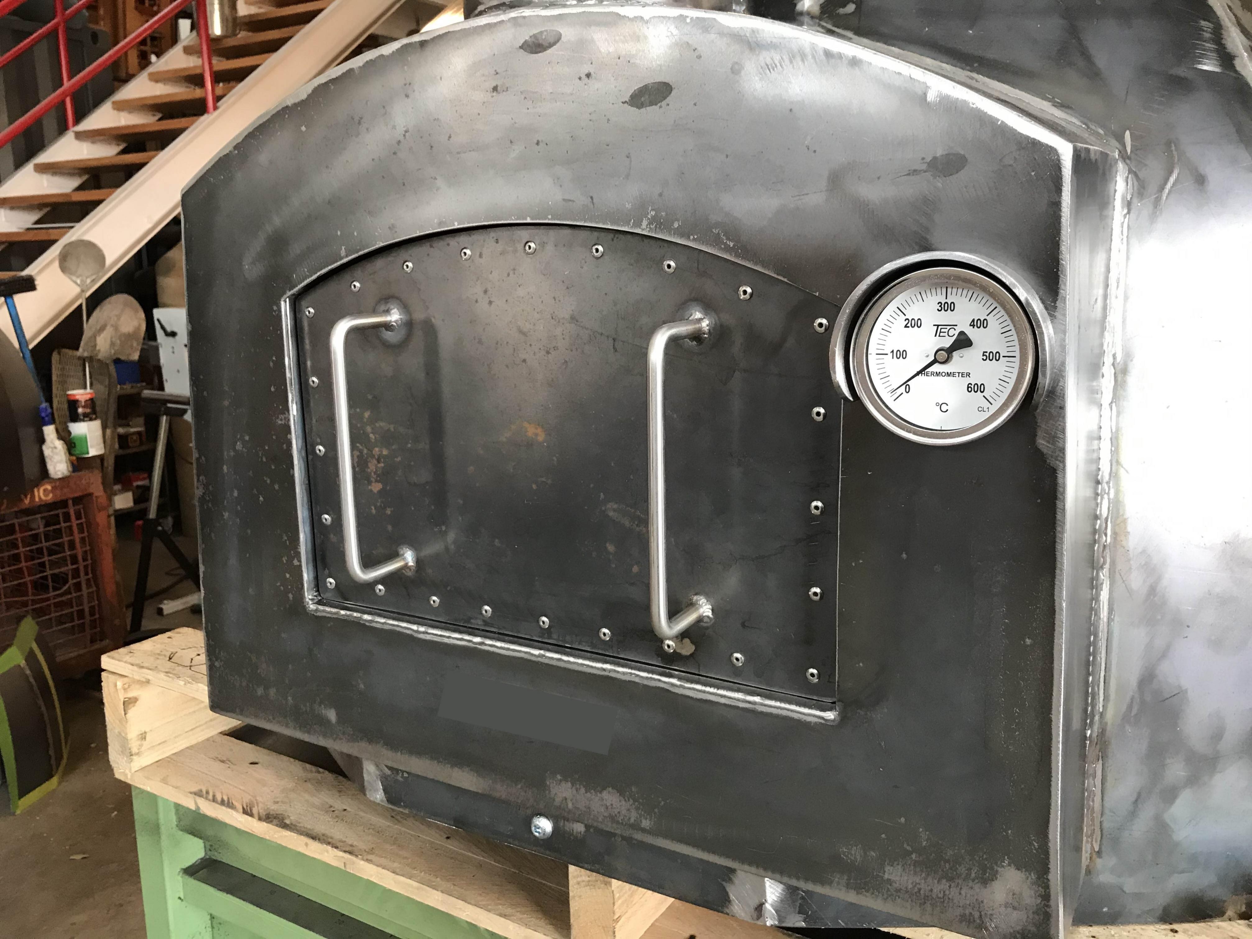 0.7mm staino inner, the top section was curved in the sheetmetal shrinker, two layers of 25mm superwool insulation, 3mm steel plate face, 10mm staino handles, staino pop rivets.