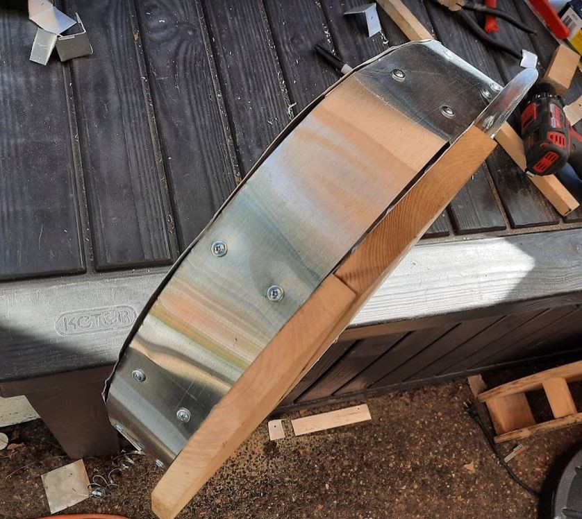 I used 16 gauge/1,5mm mild steel sheet cut and ground it based on the arch form from the bricks work. Then mig welded it all to fit. I also made the door 10cm/4" thick and filled that cavity with leftover inswool from the dome insulation. I had exactly enough wool so that worked well. Then painted with matte black stove paint (650C) and glued some bbq tape on the inside lip. I made two wooden handles from peach wood and a 4cm distance SS pipe for the bolts to go through and into the door. On the rear side I tightened the nuts and when the fit looked alright I welded the nuts to stay in place to allow unscrewing or replacing the handles from the outside at some later stage if necessary.