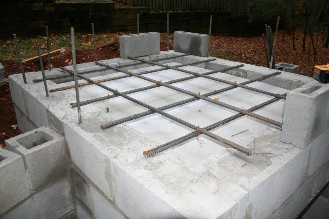 - After a couple of days, remove the 1x6 frame and extra support from under the hearth. You now have a solid, thick thermal mass which is floating suspended by the rebar.