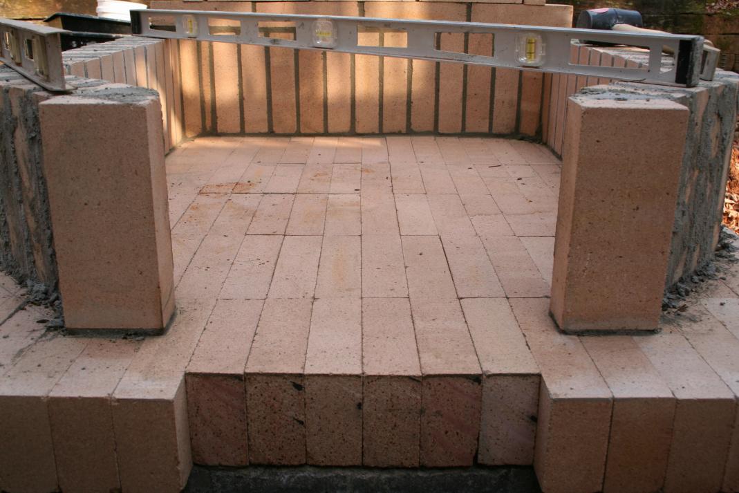 - Layer a small base of paver sand on top of the concrete hearth. Take your time on this step as its critical in getting the firebricks to be perfectly flat and level. Pound each brick in with a rubber hammer checking level and flat in all directions. Firebrick is installed on its edge. (pic 6)