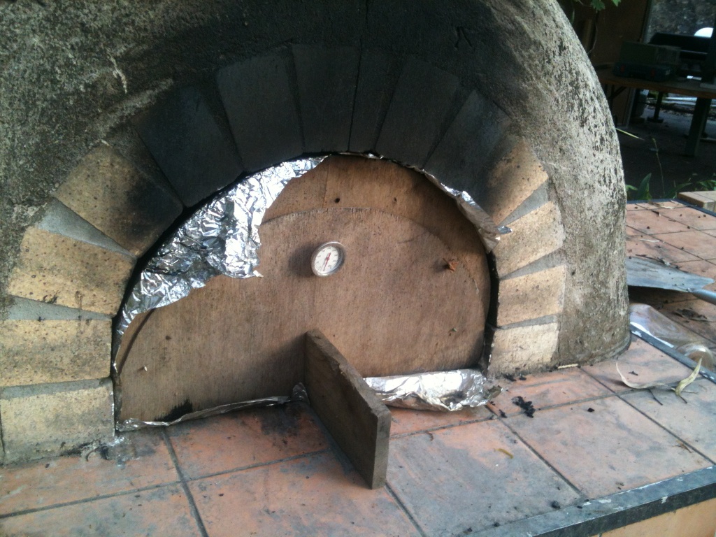 I usually fire for exactly one hour, let the flames die, push the coals to the outside and the oven is at around 250C I then place the roast and fit the wooden door(it has a 12mm insulating panel) with the door fitted the coals go out frm lack of oxygen. A wooden door works pretty well but not if the temp exceeds 300C. Without an insulating panel soaking the door may help, but the water in the door will dry pretty fast, then you're cooking your door. Facing the door with sheet steel won't achieve much because as the steel or alum. is conductive it heats up fast and still cooks your door.