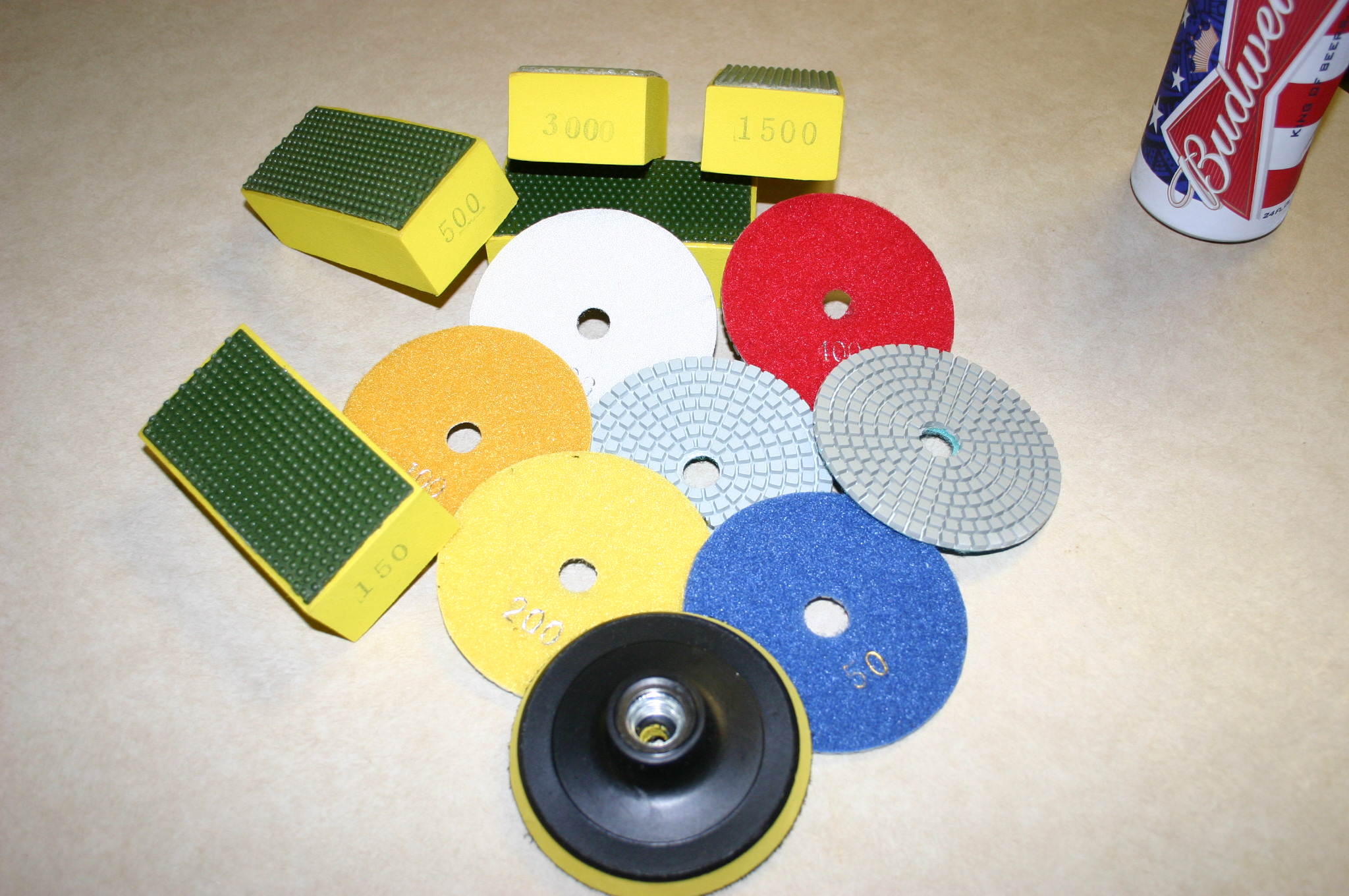 They are the rectangular blocks in the pic. They are diamond coated sponge pads. I got mine off ebay. I think that Stoncutter recomended them or something similar for the curved areas. They did work great for the curved areas of my polished concrete.