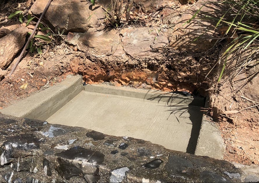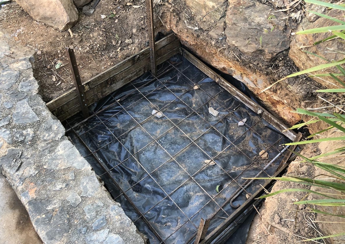 So to my situation. The only available practical place to build near the house is on the ground behind a concrete rock wall about a metre high. See below photo. This is out in the open and as we live in the tropics, it would be subjected to weeks of heavy rain at a time, not to mention it's in the garden and would cop additional water from hosing. Not really practical to build a roof over it and it wouldn't suit the immediate surrounds.