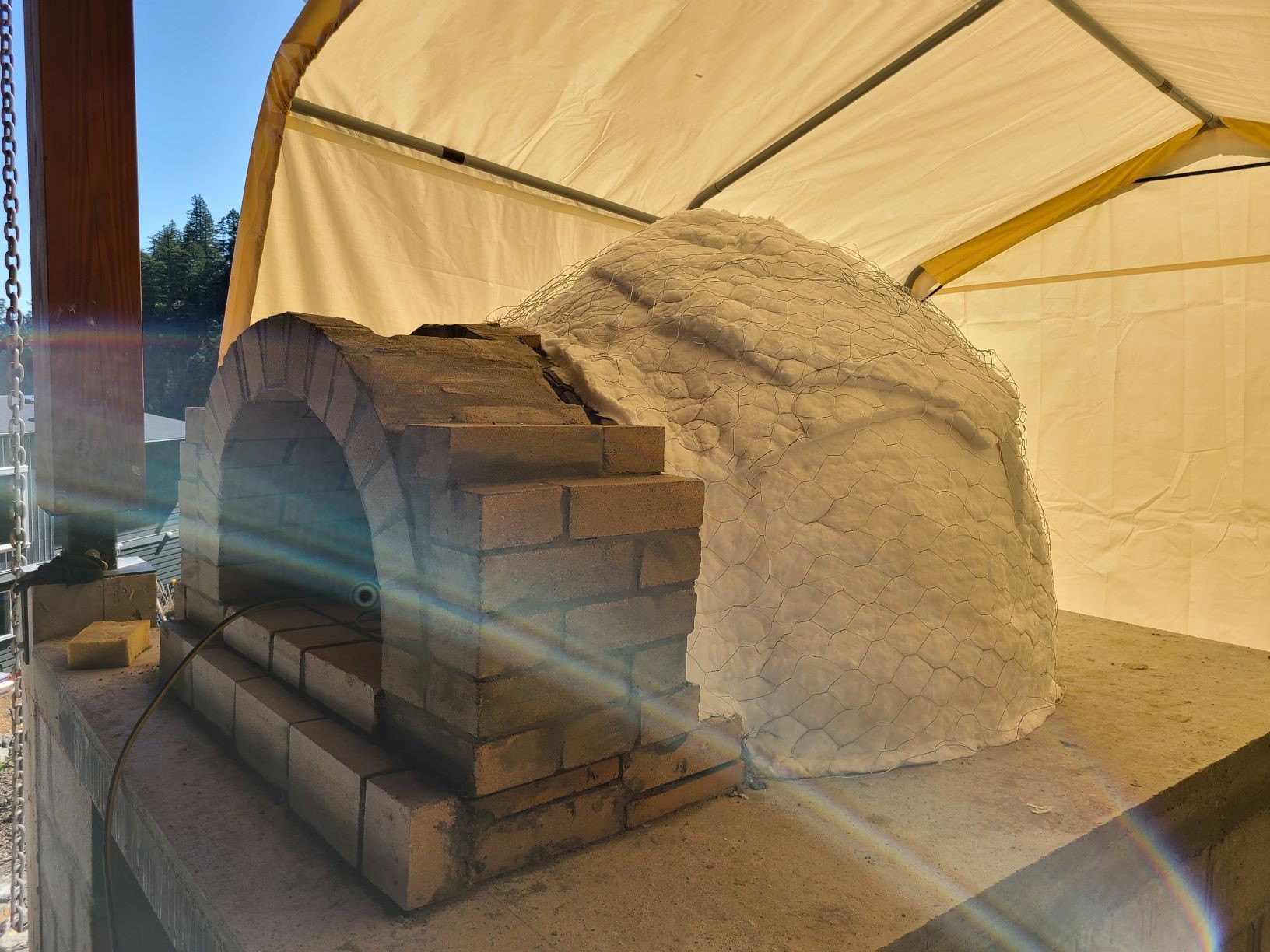 I decided that I'd do a render coat. I have six 4-foot bags of vermiculite. I used 3 to coat the dome to this point. The remaining 3 I'll pour straight over the dome once I build the doghouse walls. My thought is that I need to remove my portable shed covering in order to build my walls and roof and to allow room for my mason to build the chimney so I might as well get the insulation protection layer on the dome now. I've got a pro doing the chimney in a finishing brick and stone finish. He starts once we get the walls built which will hopefully be in early April. I did put a ceramic rope heat break between the inner arch and the outer archway.