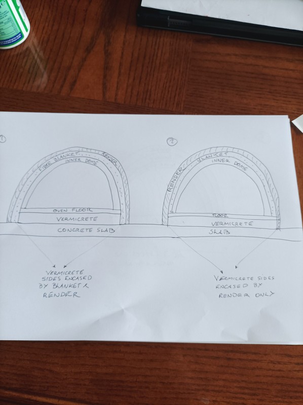 Regarding your material selection for the insulation layer my prior advice re Ciment Fondu also applies. Because this layer will not have direct flame impingement Fondu is both expensive and way overkill IMO. Adding sand to the insulation layer increases thermal mass and conductivity in turn reducing insulation value as does the ciment fondu. Only just enough cement to bind the materials is required to produce a layer that will insulate well. Because vermiculite in the mix is so hygroscopic, the wet mix against the inner dome can present problems when eliminating the water from the oven after it is first built. A layer(s) of ceramic fibre blanket is far preferable over the dome because it is dry, then a vermicrete mix over the blanket can be applied which will even out the lumps and bumps of the blanket as well as providing a firm substrate for the outer stucco/render layer.