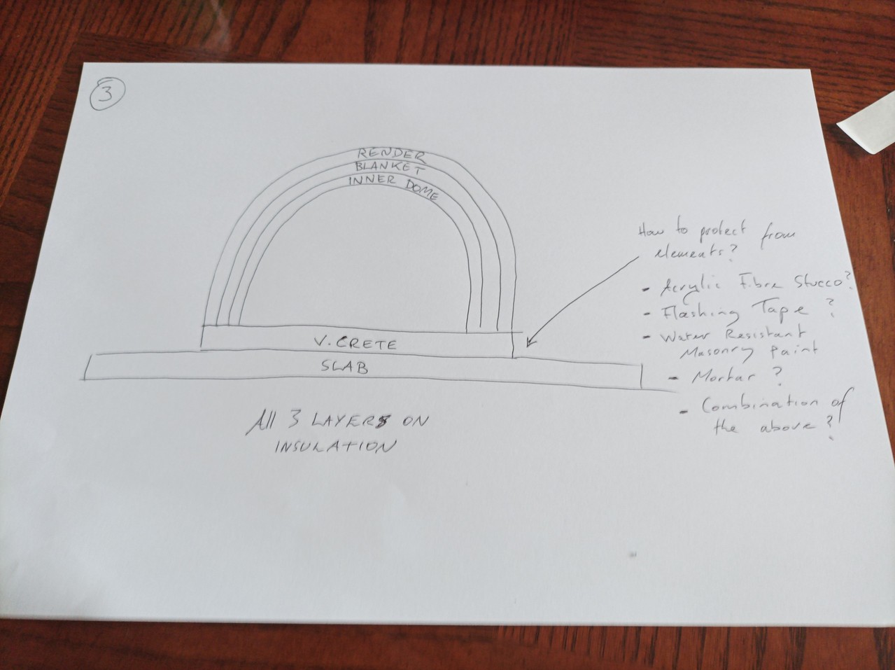 Other plans will have all dome layers (inner cast, blanket/vcrete/outer render rest on the vermicrete insulation slab. (See #3)