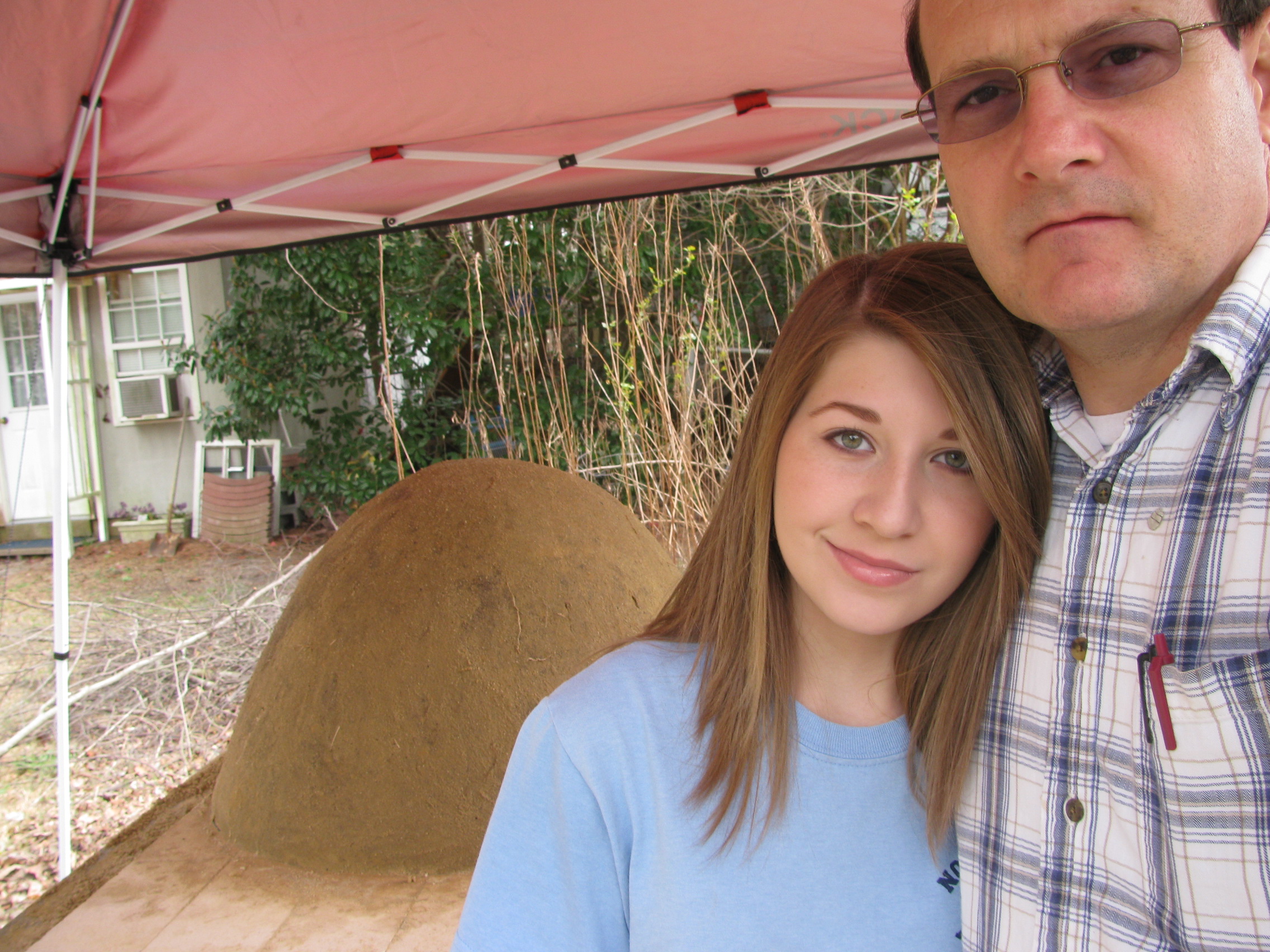 The oven is 27 inch inside diameter. The cob is 3" thick and will later be covered with 3 or 4 inches of insulation. The hearth is firebrick over a 2.5 inch insulated vermiculite/concrete mix. Cob is 1 part clay, 1 part red sand, 1 part fine sand, 1/2 part course sand mix, and just a little shredded wheat straw.