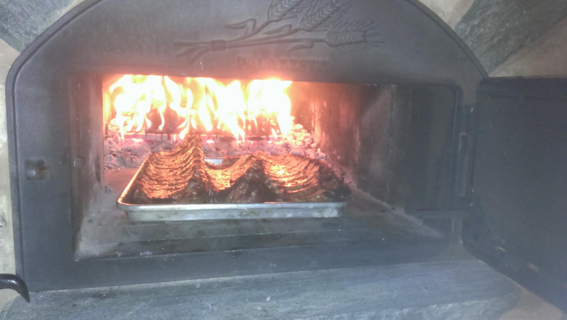 The combined 240,000 BTUs I believe are four times as powerful as some of the marketplace gas jets for pizza ovens I see in the internet. The custom made cart and 3 awesome burners will cost under $900.00. Multipurpose, too! They can heat the floor of the oven, and simultaneously allow heat to go up and around the two sides, thru slots/vents in the firebrick adjacent to the oven's barrel shaped walls. We'd have a larger vent in the back, to best emulate the flames seen in my old pizza oven cooking ribs below.