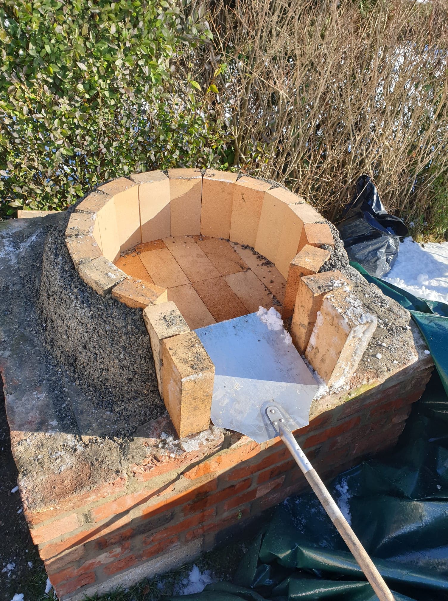 I followed this with a ring of firebricks to form the bottom 22cm of the inner oven. I then packed 5:1 vermicrete around this to hold them in place and to act as insulation. This was covered with a tarpaulin to dry