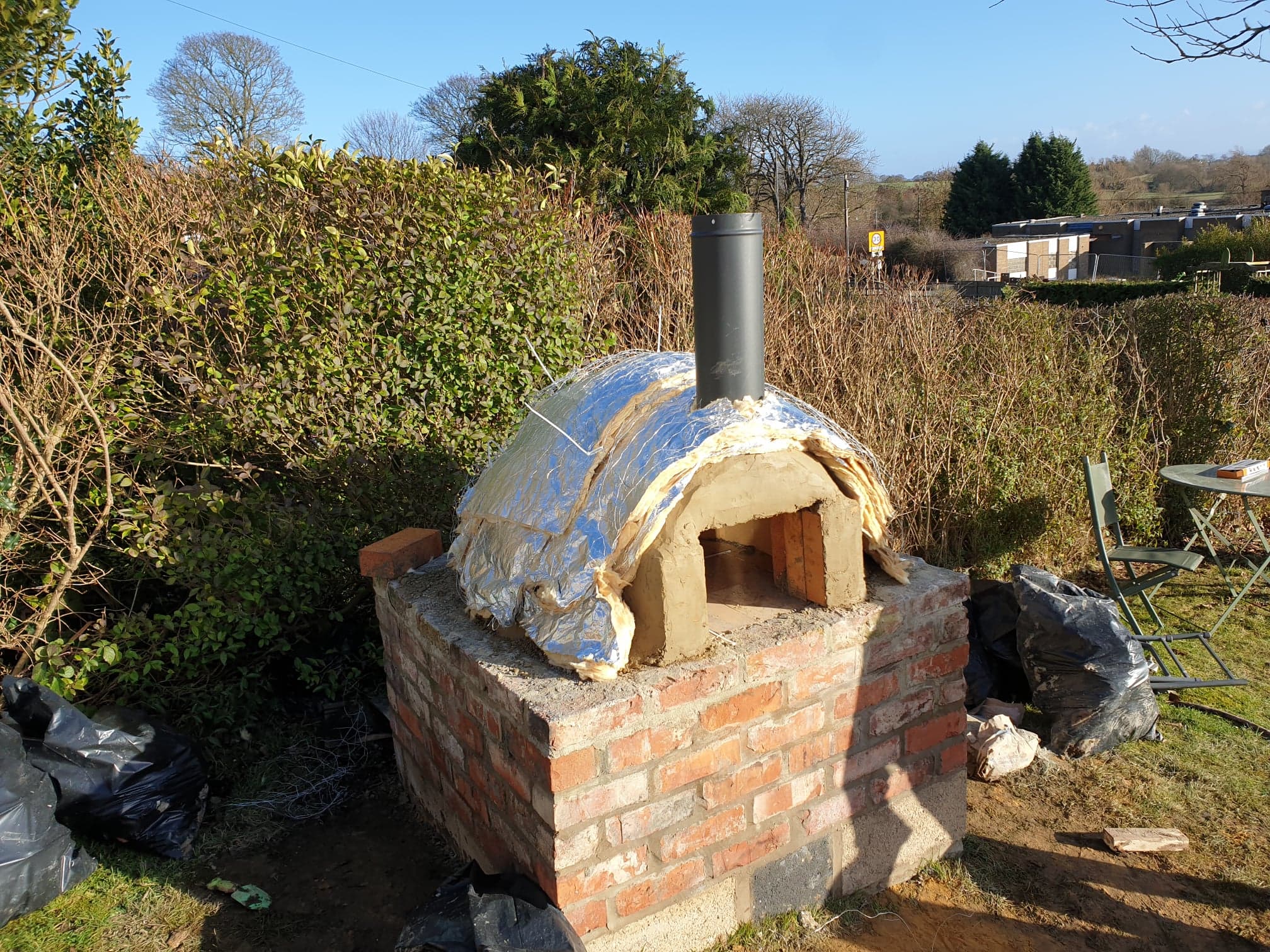 The whole oven was then insulated with 2 layers of glass wool pipe lagging insulation held down with chicken wire and then skimmed twice more the first time to cover up the chicken wire the last as a smooth decorative coat.