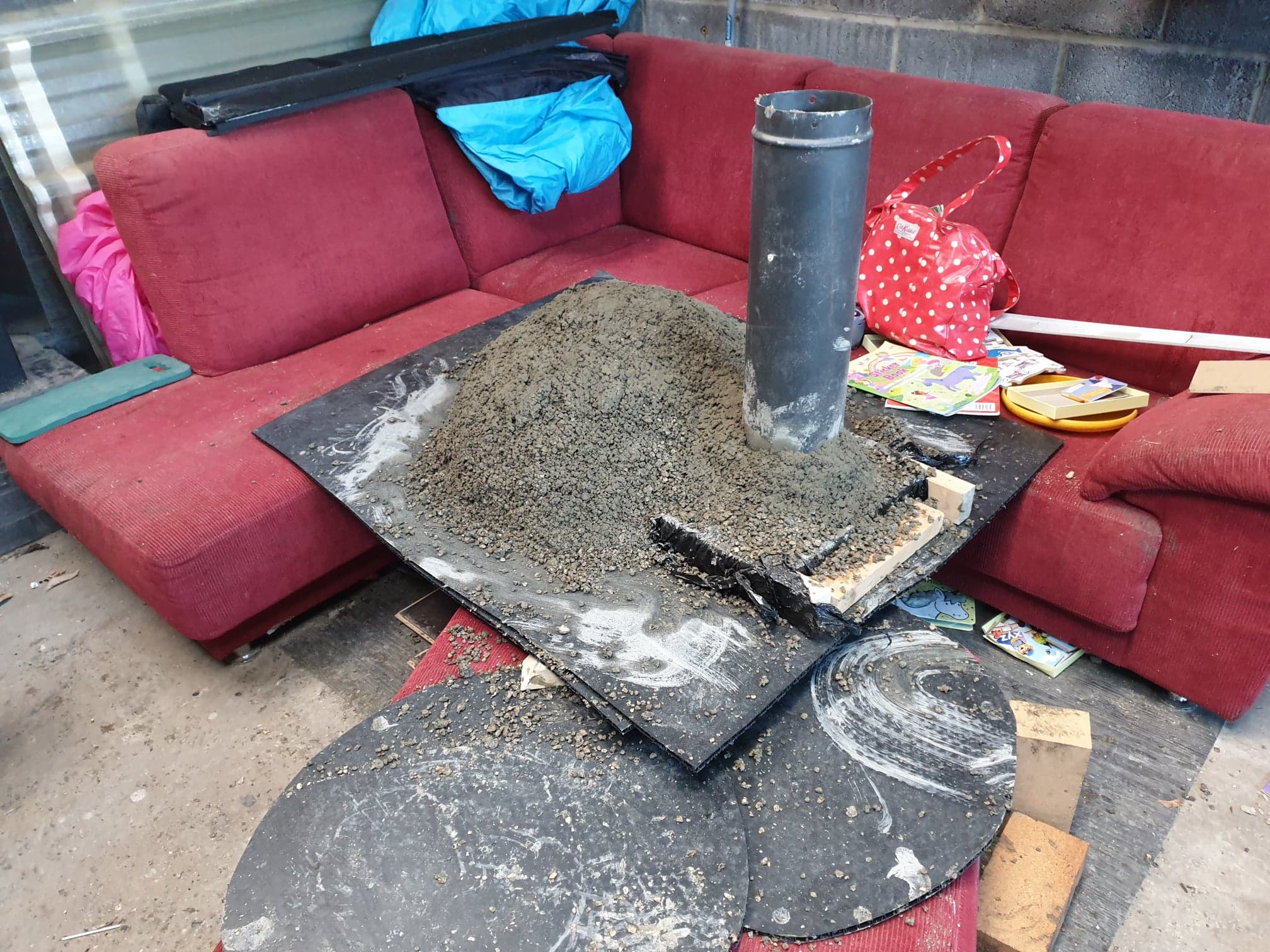 I made a mould in the garage to form the top curved portion of the inner oven the flue (6" logburner flue) was cast in at this point.