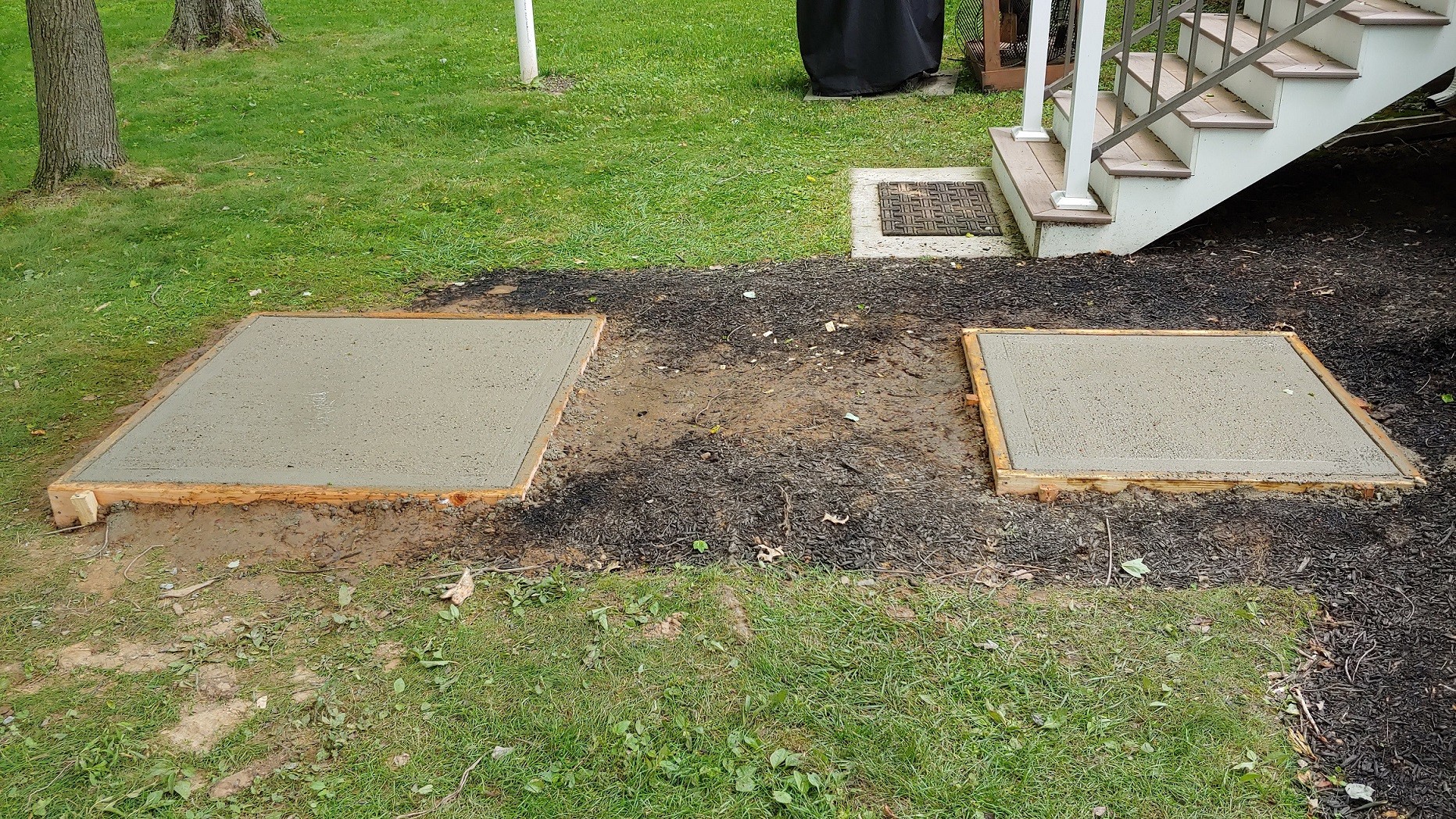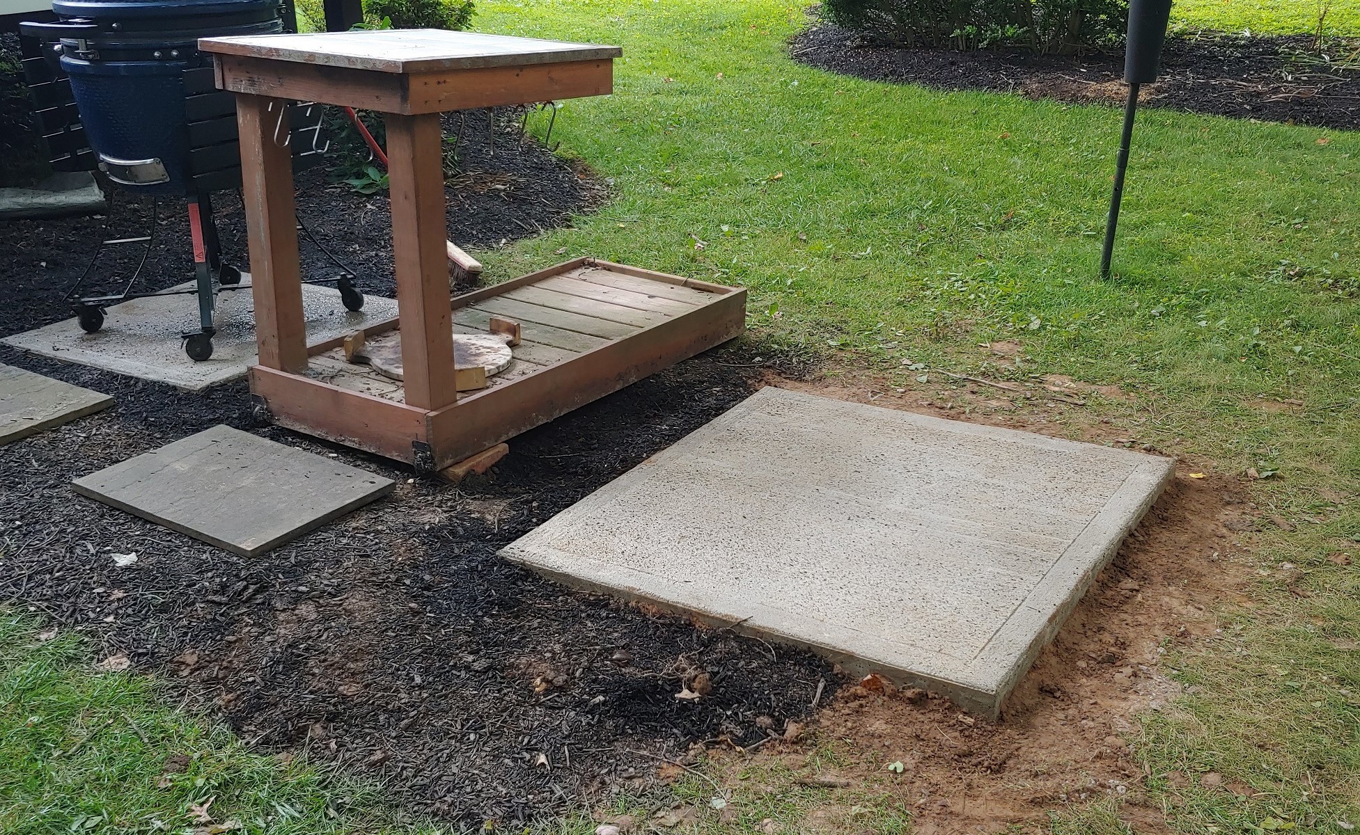 Hired neighbor's kids to pour the slab and my daughter(enjoyed it!!!) helped me build the stand out of wood. No way I could build it out of blocks. I have been doing woodworking with my lousy back for years and years, so I knew I could build it out of wood but not blocks. Now everyone laughs because they think I have overbuilt the stand. Let them laugh... I just like the look of 6x6 lumber.