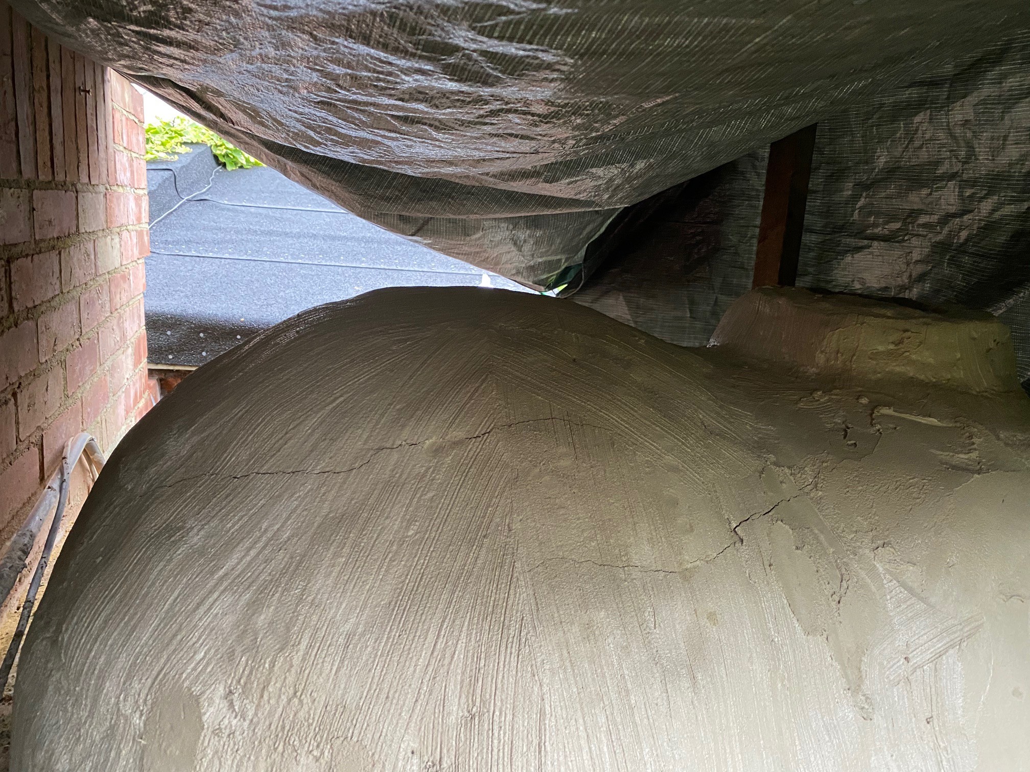 The home-brew contains a high proportoion of clay so is more prone to shrinkage cracking than castable refractory. If the mix was a bit wet the shrinkage is increased. Get to filling the cracks ASAP while the casting is still damp Remove the sand and treat the dome likewise from both inside and outside. I use hessian bags to keep in the moisture but anything will do. Cover also with a tarp.If you use a wet blanket you could also keep it for parties (joke). The casting should be kept damp for a week to enhance strength.(see attached pic) It looks like you've done a pretty good job.