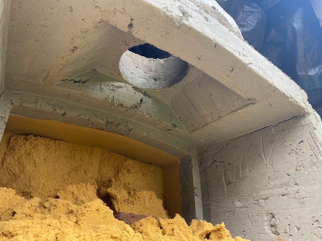 The sand can be removed after a day or two and you want to fill any voids while the casting is still damp. After that task has been done the casting should be kept damp for at least a week to enhance strength, after which it needs drying in the sun and wind, weather dependent for a week.Kindled with zeal and fired with passion.