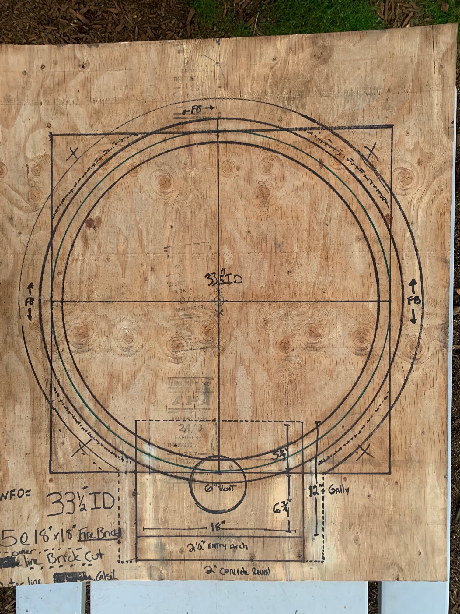 I have done a design template that I want to share with you... the sizing of my oven revolves around the size of the fire bricks I could reasonably get to Hawaii and to simplify the cutting process.... 5 @ 18x18 oven floor fire bricks... 36x36 total for the dome... plus the one for the galley... I chose an inner diameter of 33 1/2 inches as to fit it onto the 36 inch fire bricks... here is the layout.... everything look ok? Let me know your thoughts... thank you