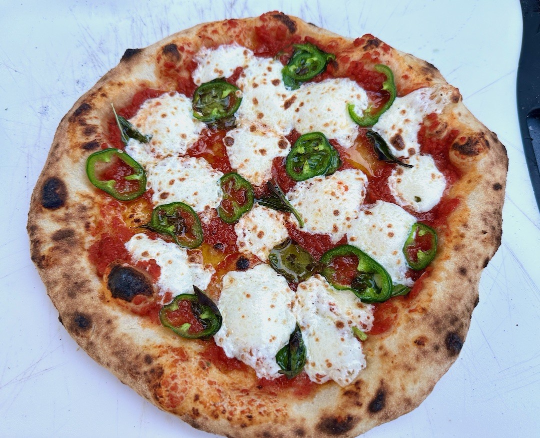 The pizza below is a Margherita with jalapeño slices. The crust is very, very close to what I'm shooting for and cooked in 90 seconds. Time will tell if I can repeat this but for now, this'll do nicely.