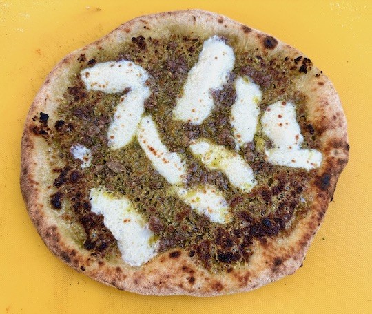 Here’s the finished oven along with a Pistachio Pesto & Sausage pizza from last night as well as some SD bread made this morning from the residual heat of last night’s pizza bake.