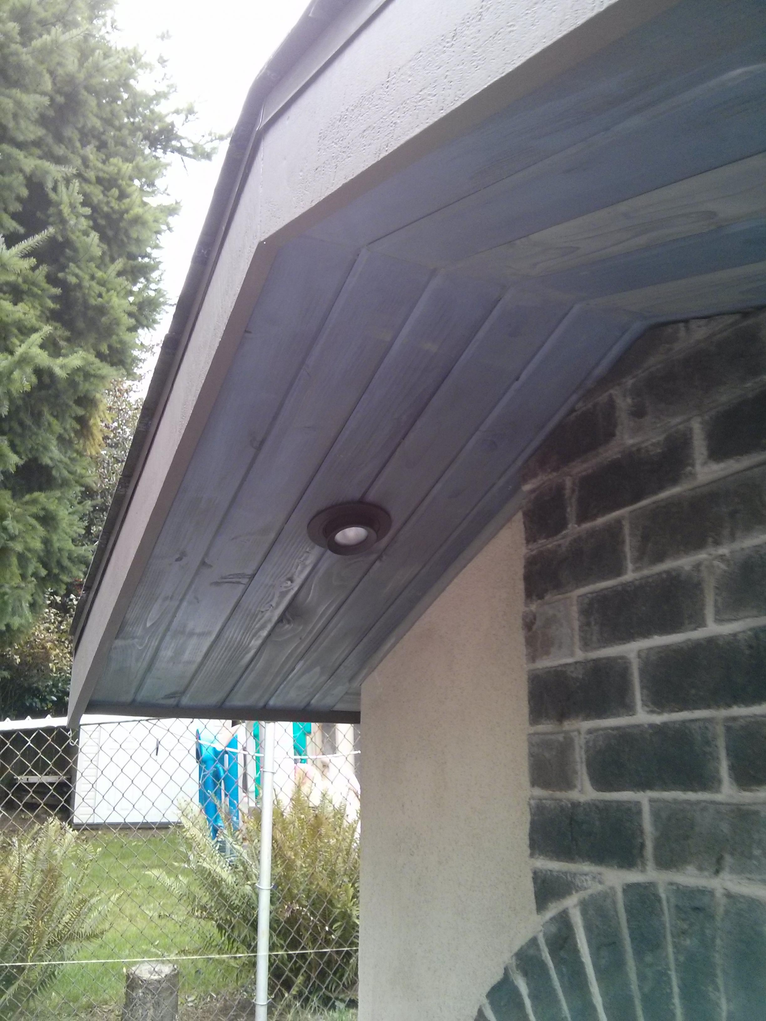 I went with a much deeper eave @ 18" because we get so much rain here - but I'd say 12" is minimum. I also used some lights that I could aim/rotate - which is a nice feature.