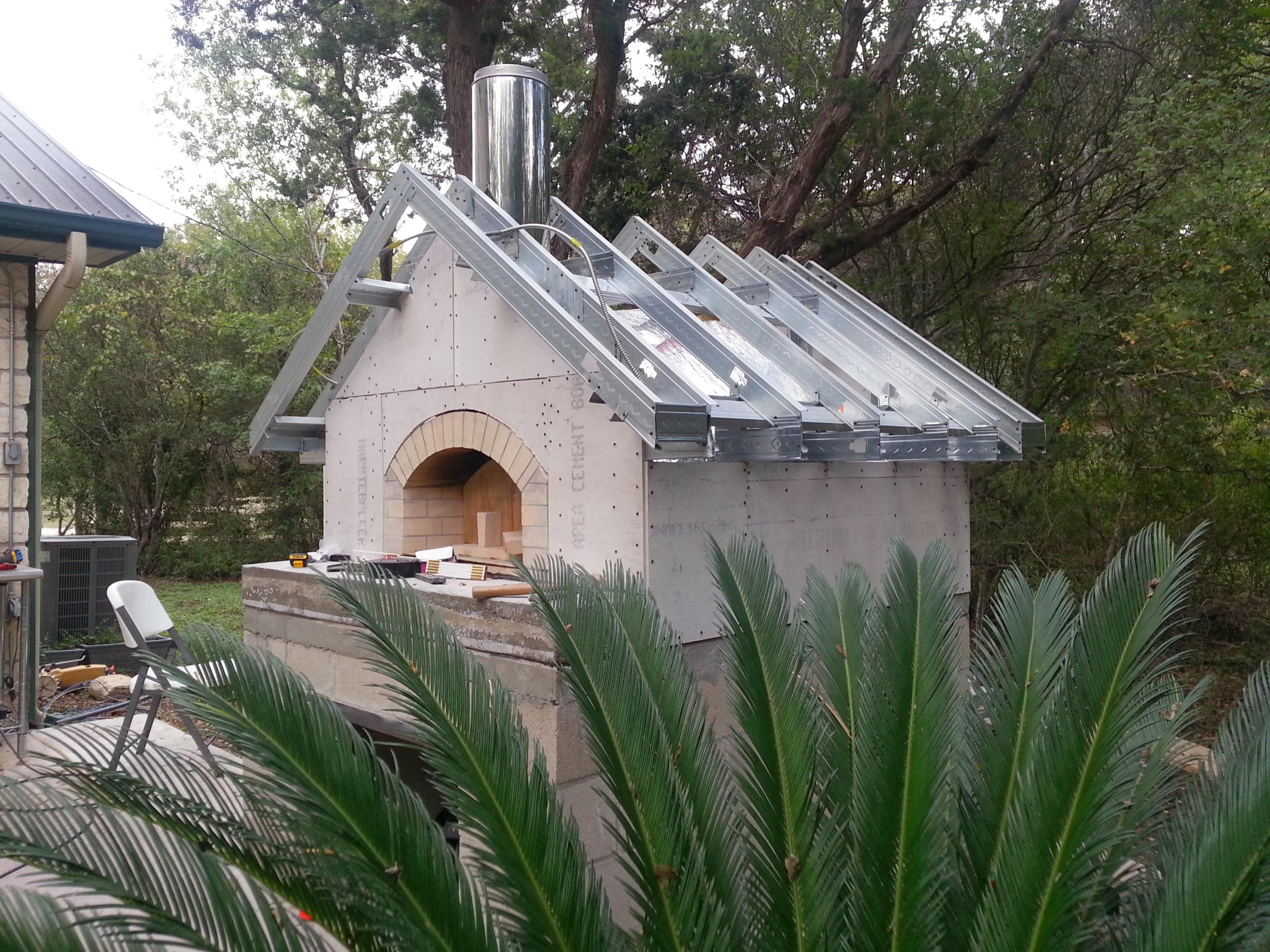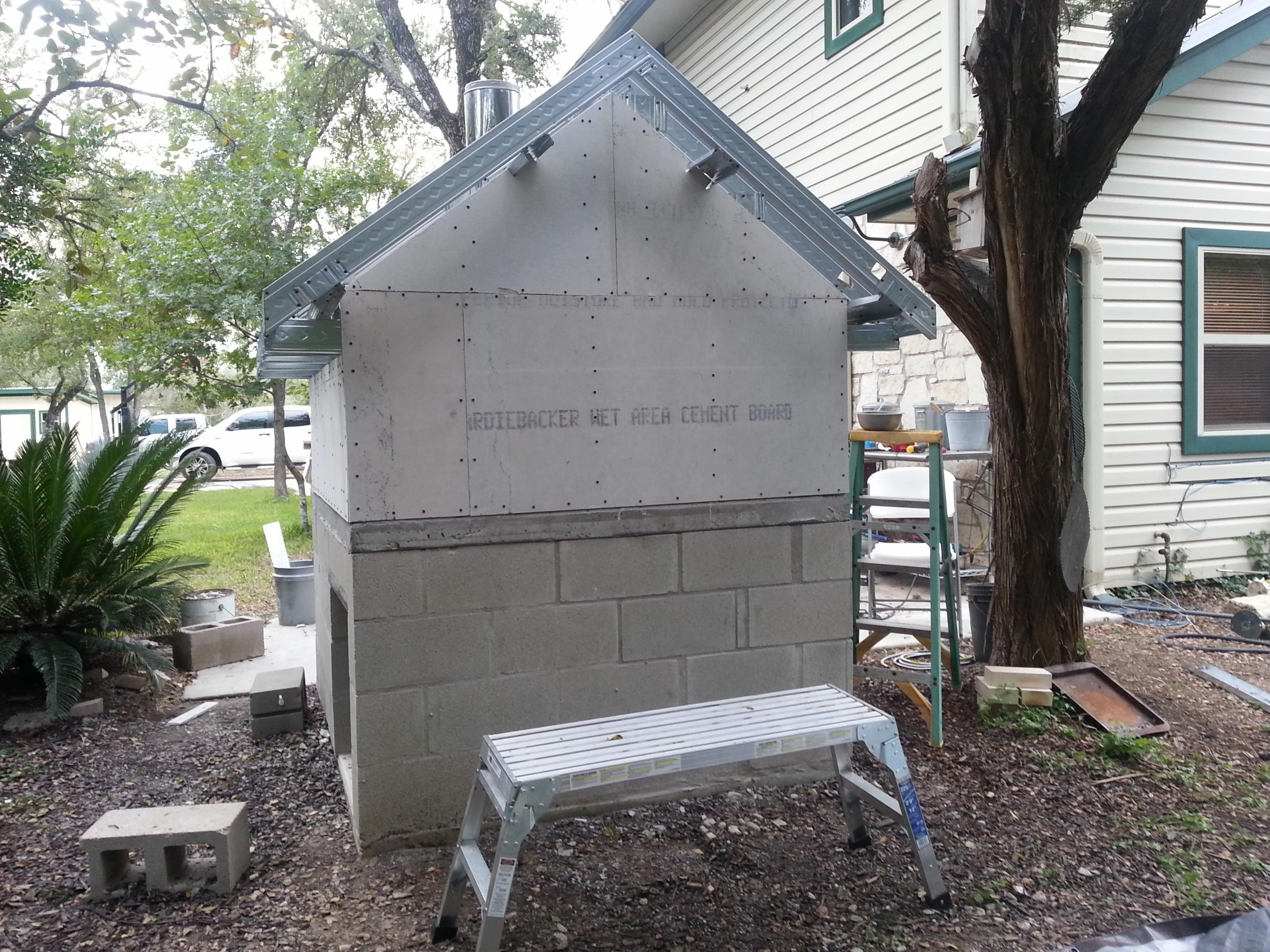 Made some progress today. Got the Hardi Backer complete as well as the Electrical. I'll be using a Brick Veneer over the Hardi and Block. Havent decided on roof yet. Looking at Copper and Tile but not sure I have enough support for Tile. Im looking for an old-world Italian look. Open to suggestions. Our Home is White Limestone with Metal roof but didnt want to try to match that. Would rather have a contrast to the existing look.