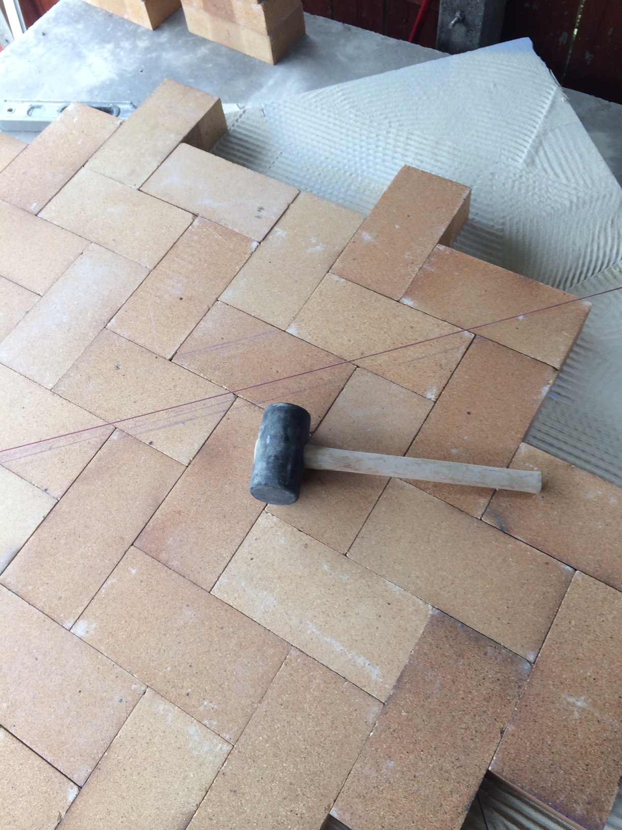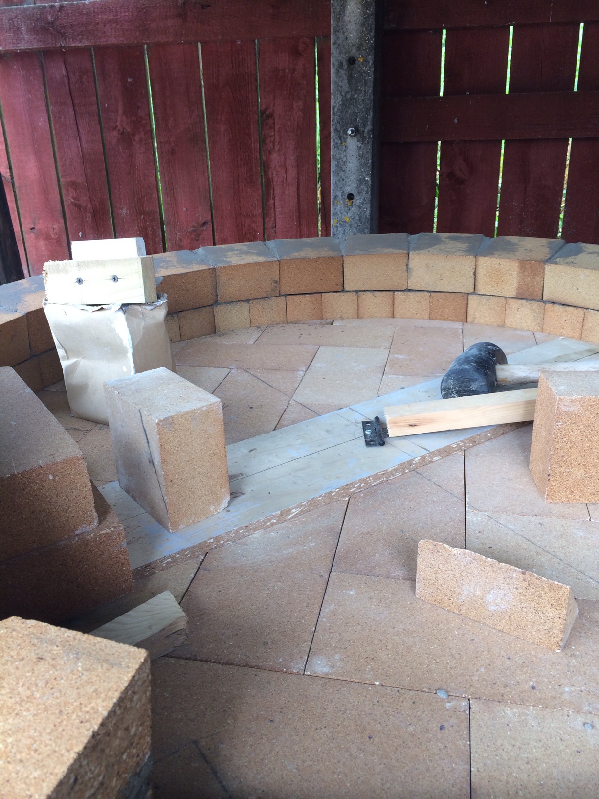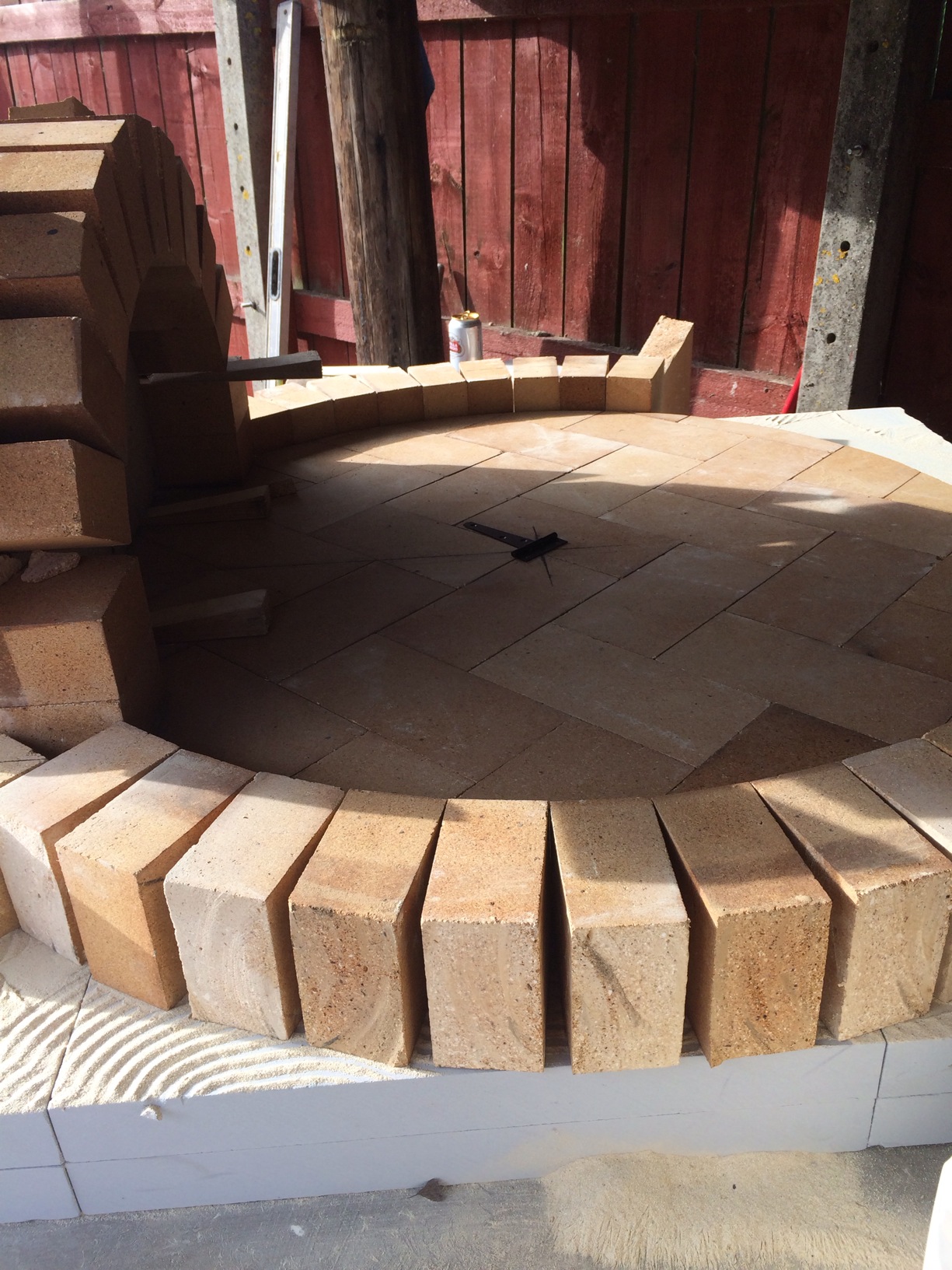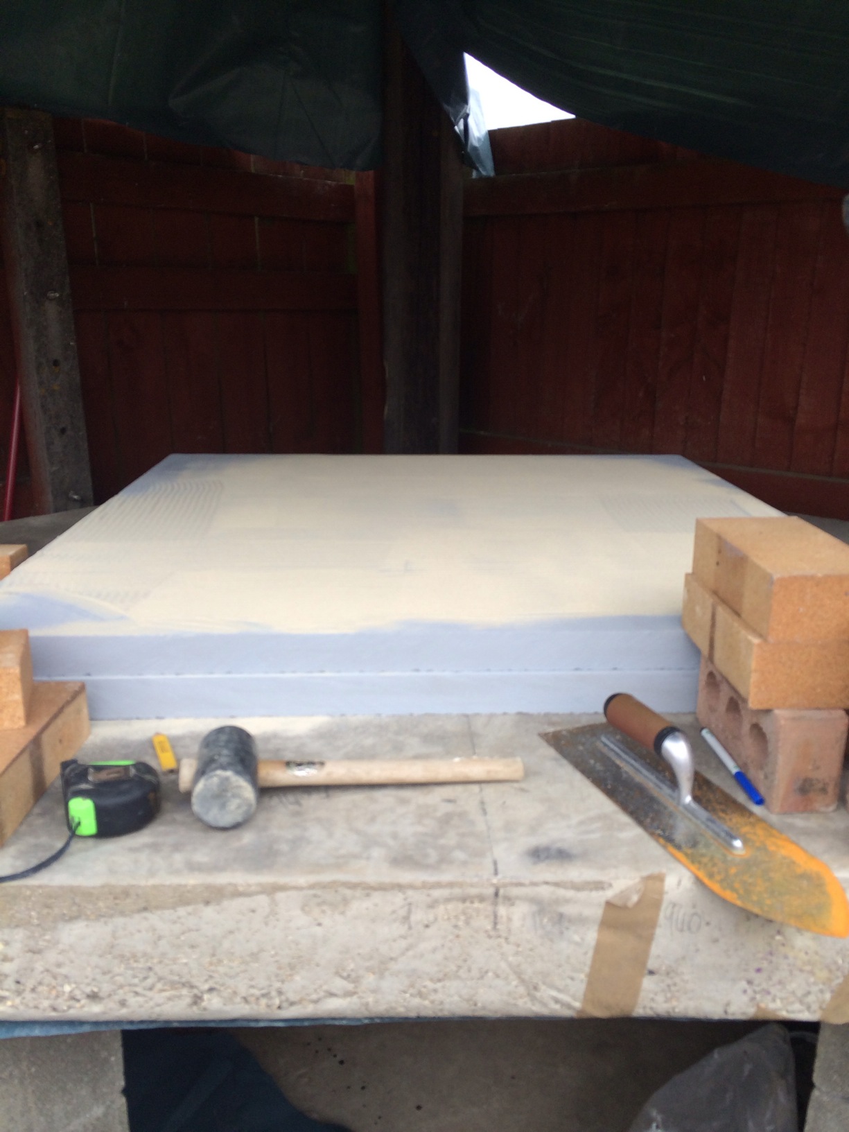 so the week of has arrived so i got to start the the oven floor after putting up a temp. roof because i know my luck it will rain for sure. laid 5 sheets of 50mm calcuim silicate board to form a 100mm layer of floor insulation i used dry grog with a notched trowel to level the brickvery intolerant brick sizes proved to be a pain but looks ok