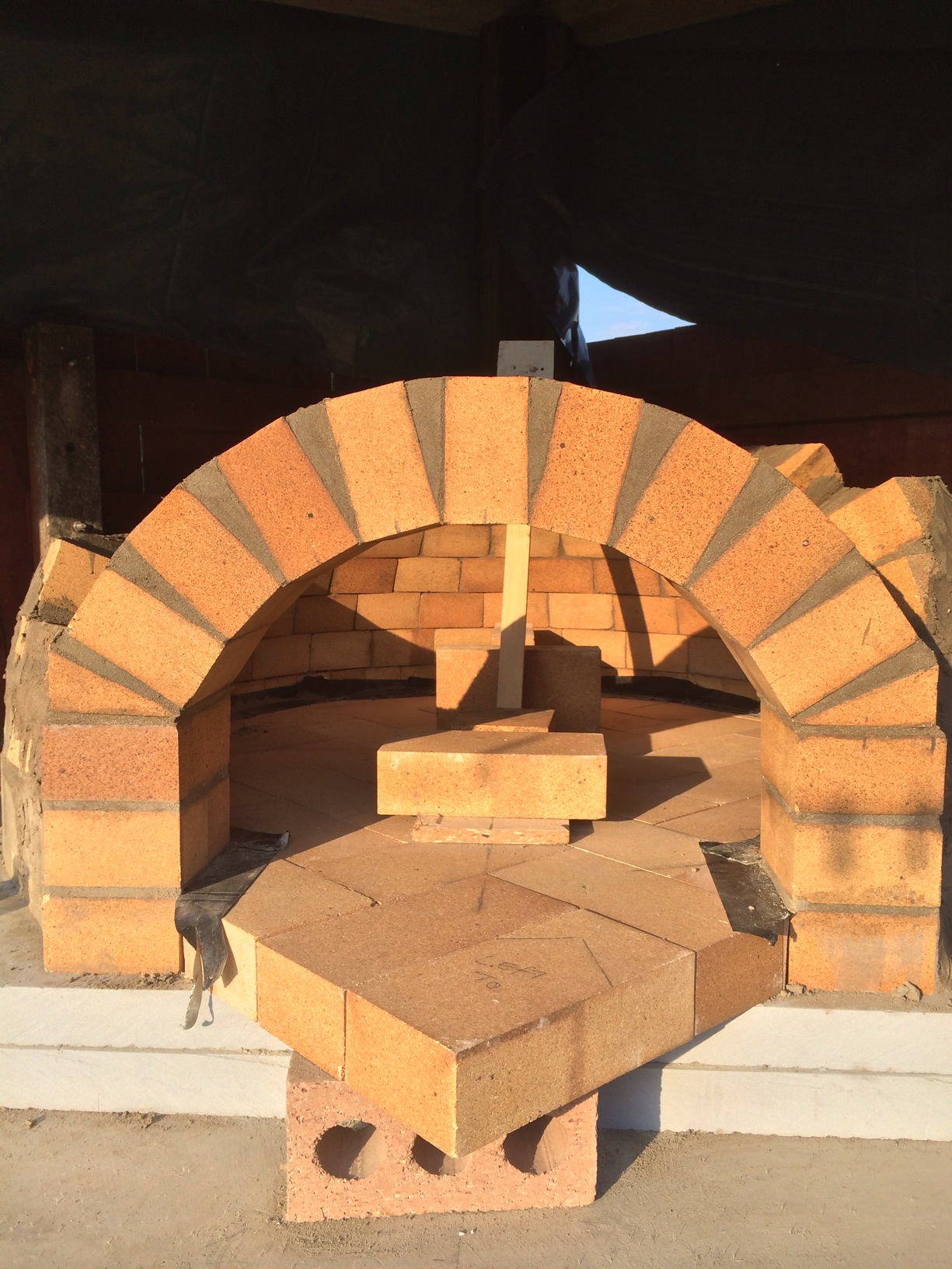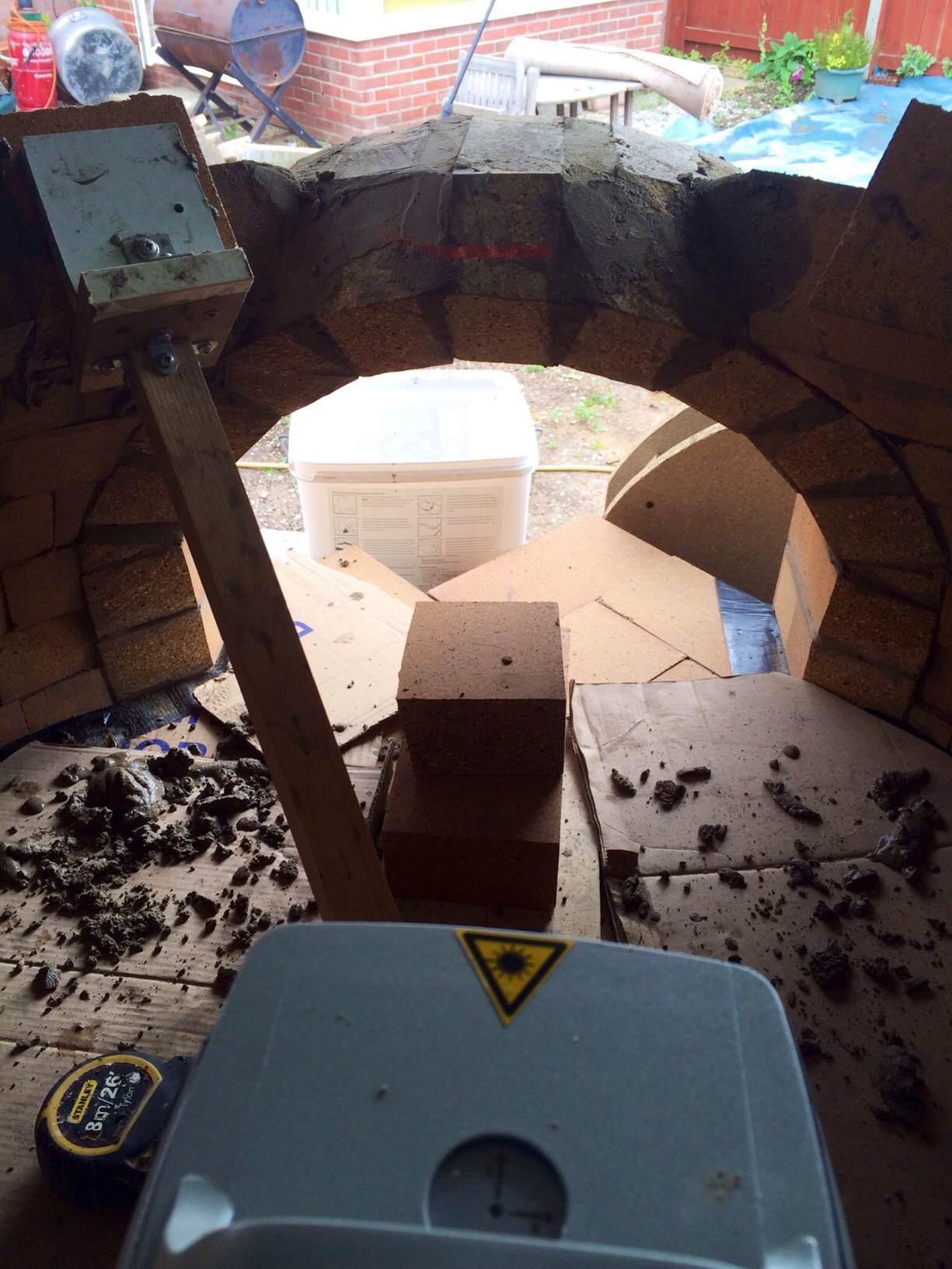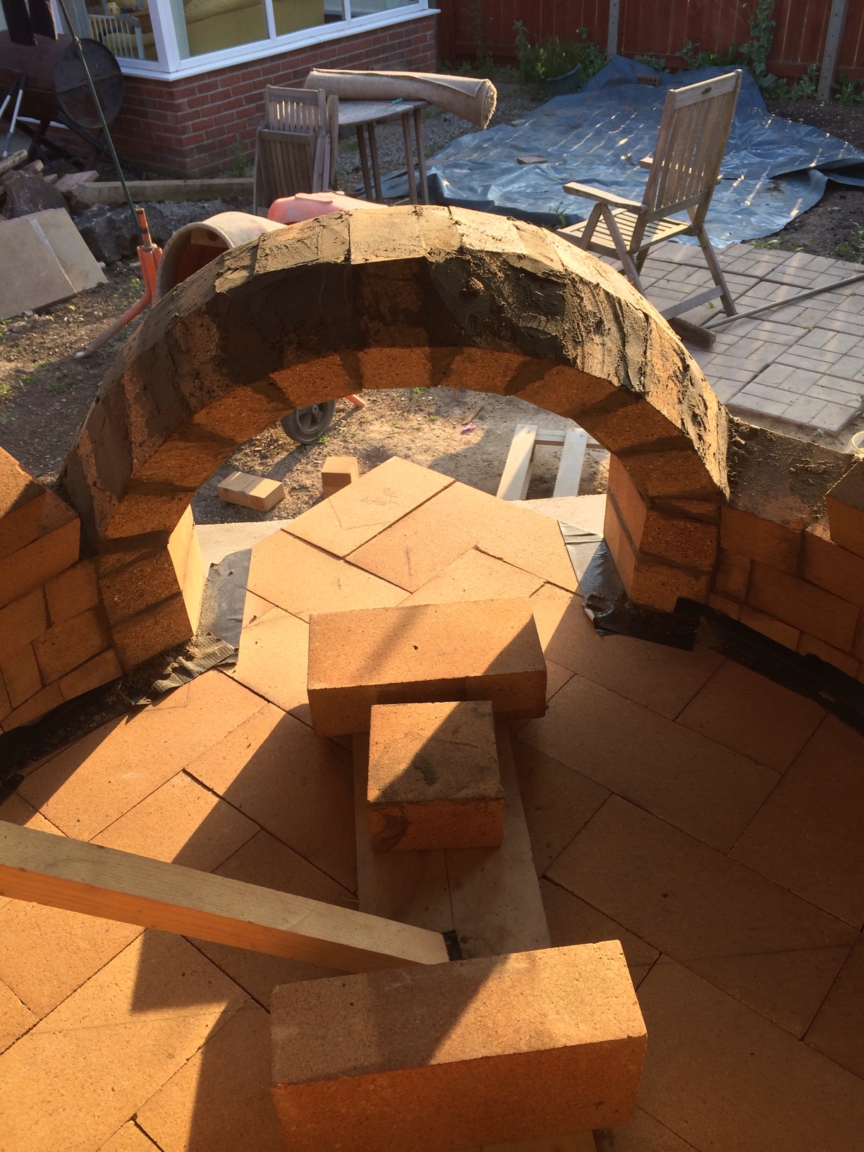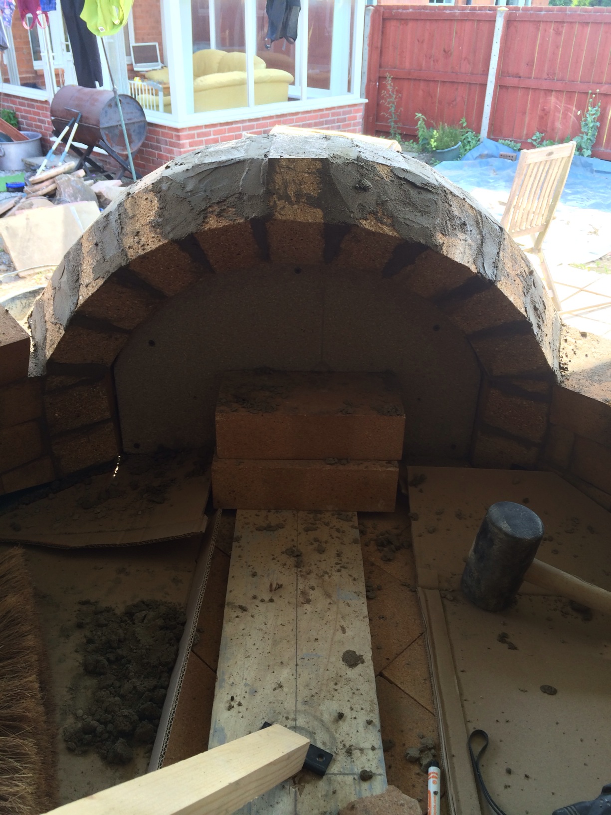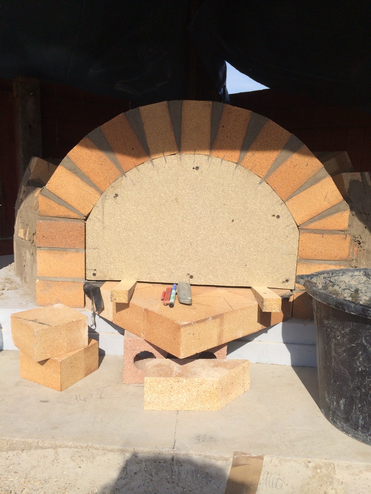 i few pics from yesterday didnt get chance today theseoven builds make the day fly slow progress mainly due to the mortar i used grog is hard to work with as soon as it hits the brick it dries out ive takken taking the brick straight from a bucket of water on to the bed time taking stuff also having trouble with the tapered arch i thought the would all be the same cut but be at the top my it is short which means every cut gets bigger to top of arch ? i got another course plus 6 lone rangers on next course for tomorro