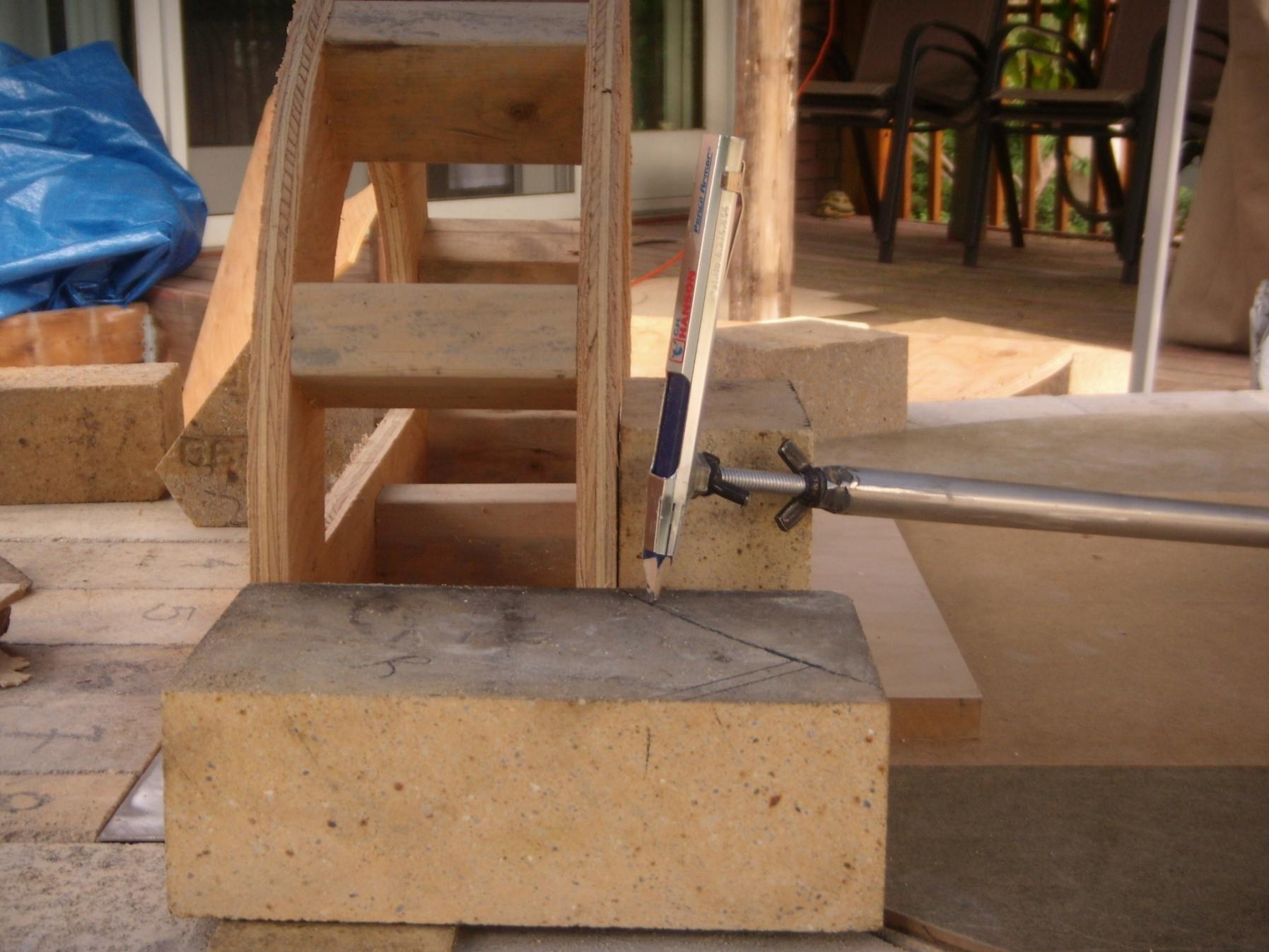 4" of CF board and 12 x 12 x 3 tile are all set on the hearth. Inner arch form is set and ready to go. I am questioning myself on how I cut that first brick setting next to the arch. I simply used the IT to mark the cut line as you can see. Would the next brick up use the same line for the bottom and the IT across the top? That's what my mind is telling me, but I am just not sure.3 Photos