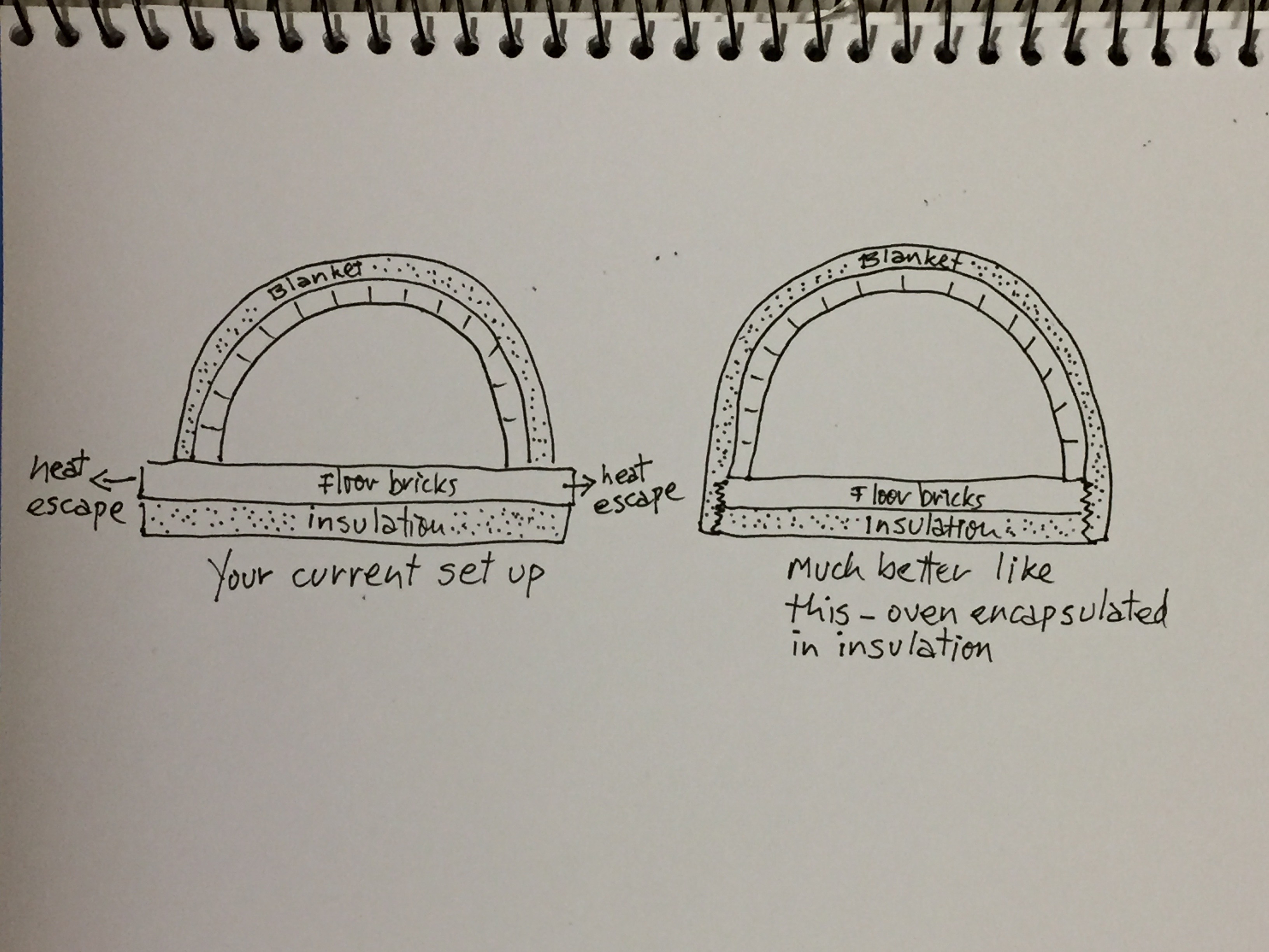 I notice that your floor bricks extend out past the blanket. The whole oven should be encapsulated in insulation otherwise heat will conduct outwards via the floor bricks. You could cut the bricks off so they don’t extend past the base of the dome. As these cuts are not seen they can be a bit rough. A diamond blade on a 6” angle grinder works pretty well, but wear a good mask. Then if you have any blanket offcuts left, insulate the space left where the floor bricks were.
