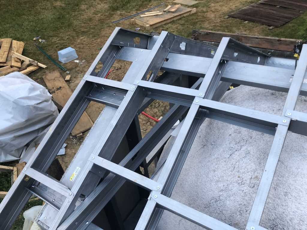 I built a jig for the steel trusses, so that they were all the same shape. I then (not shown) assembled most of the roof on the ground by attaching the offset ridge tie and end channels. I then simply lifted it into place and started securing it and adding bridging (again overkill, but I have the spare steel).