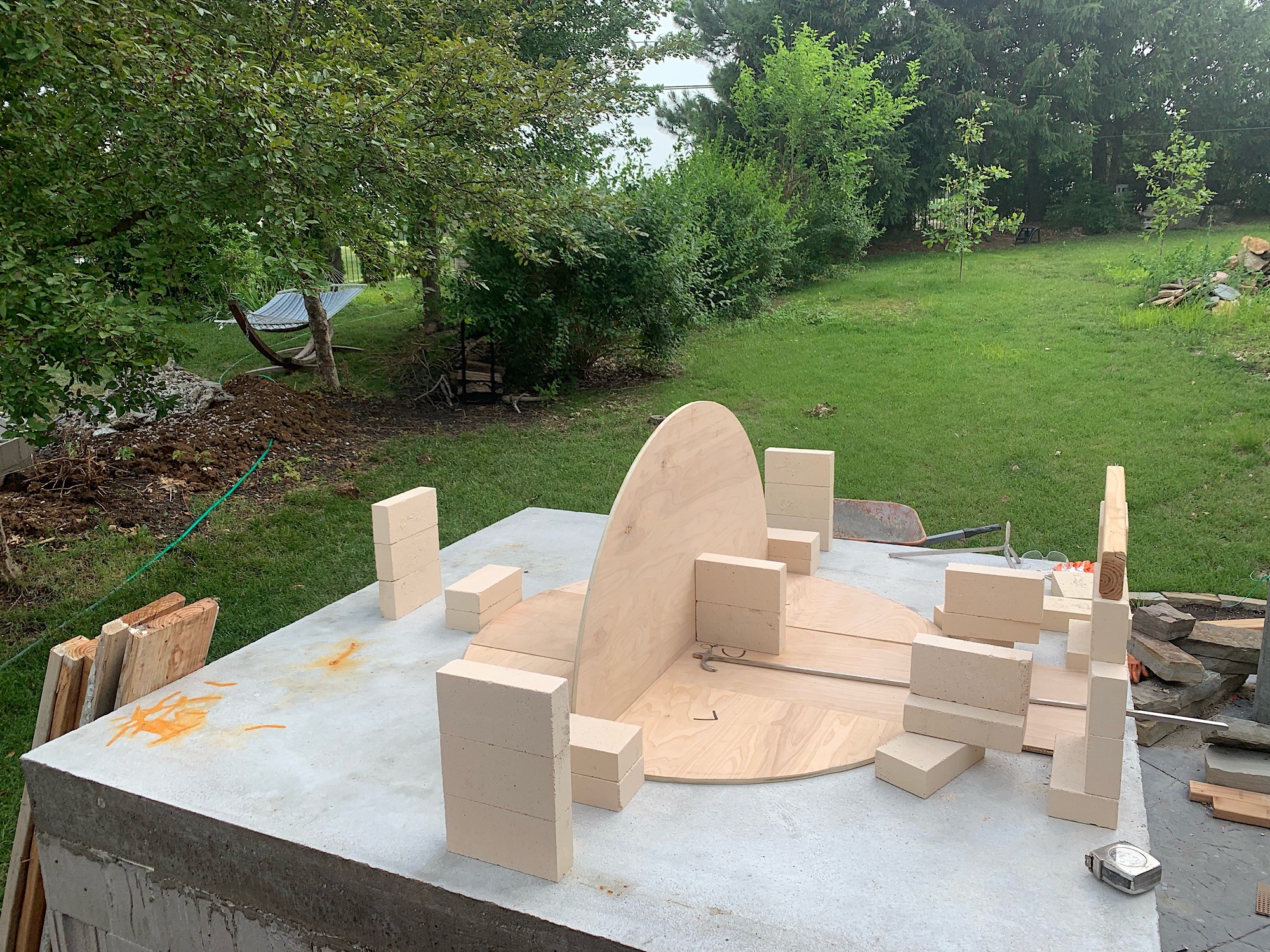 I cut a 50” internal template for the base, and a 25” radius 1/2 circle for the dome and laid everything roughly out. The stacks of brick on the outside represent the outer surface of the igloo.