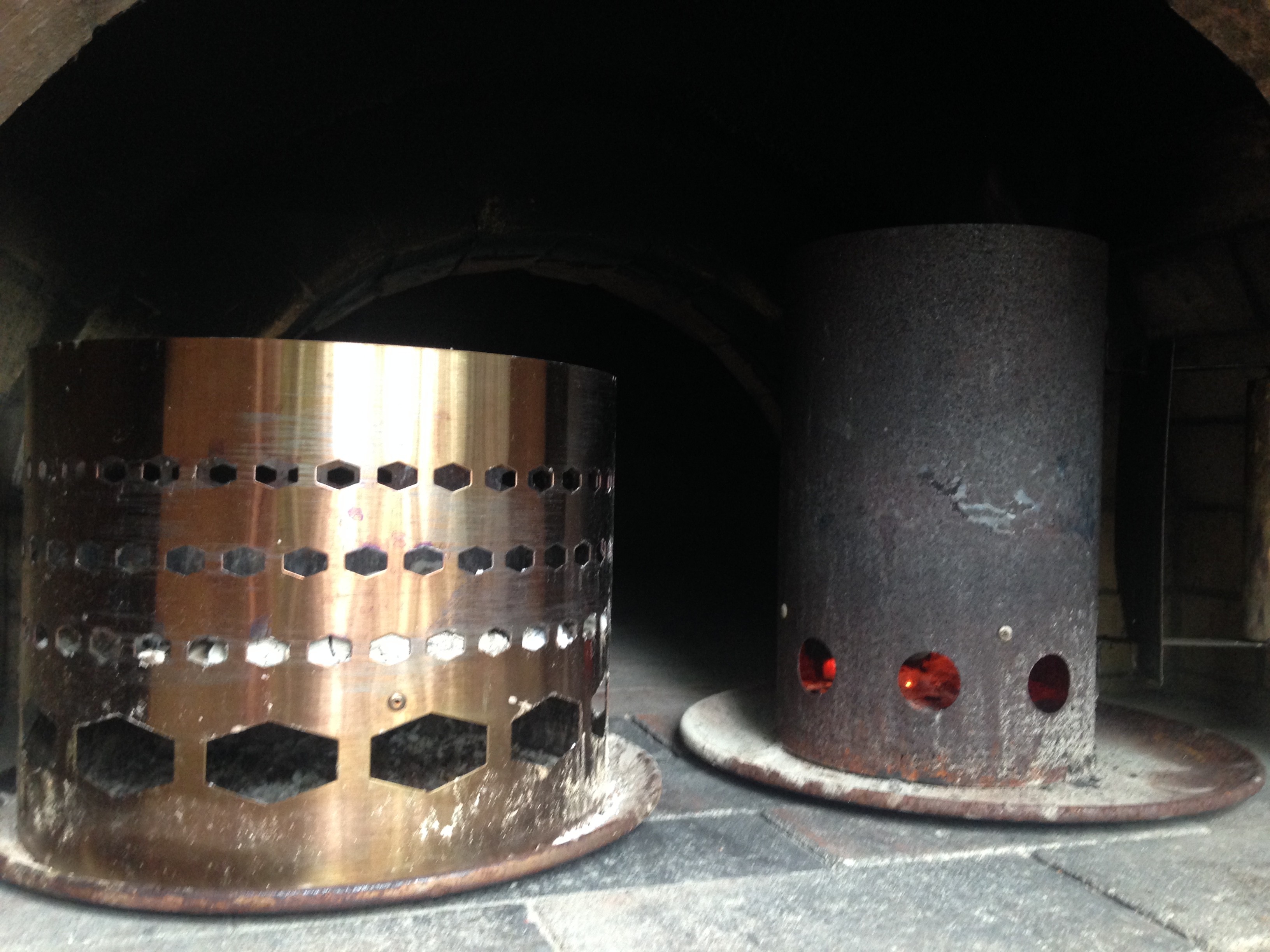 Before commercial chimney starters were available, lots of folks made their own out of large bean cans. Back then I then started my charcoal bricquettes in the entry with paper (no liquid starter). Notice the stain on the entry floor. I now use a cheap pizza undeneath and other methods to start the charcoal. I also use the starters inside the oven now with lump charcoal to add a little extra heat for certain cooks.