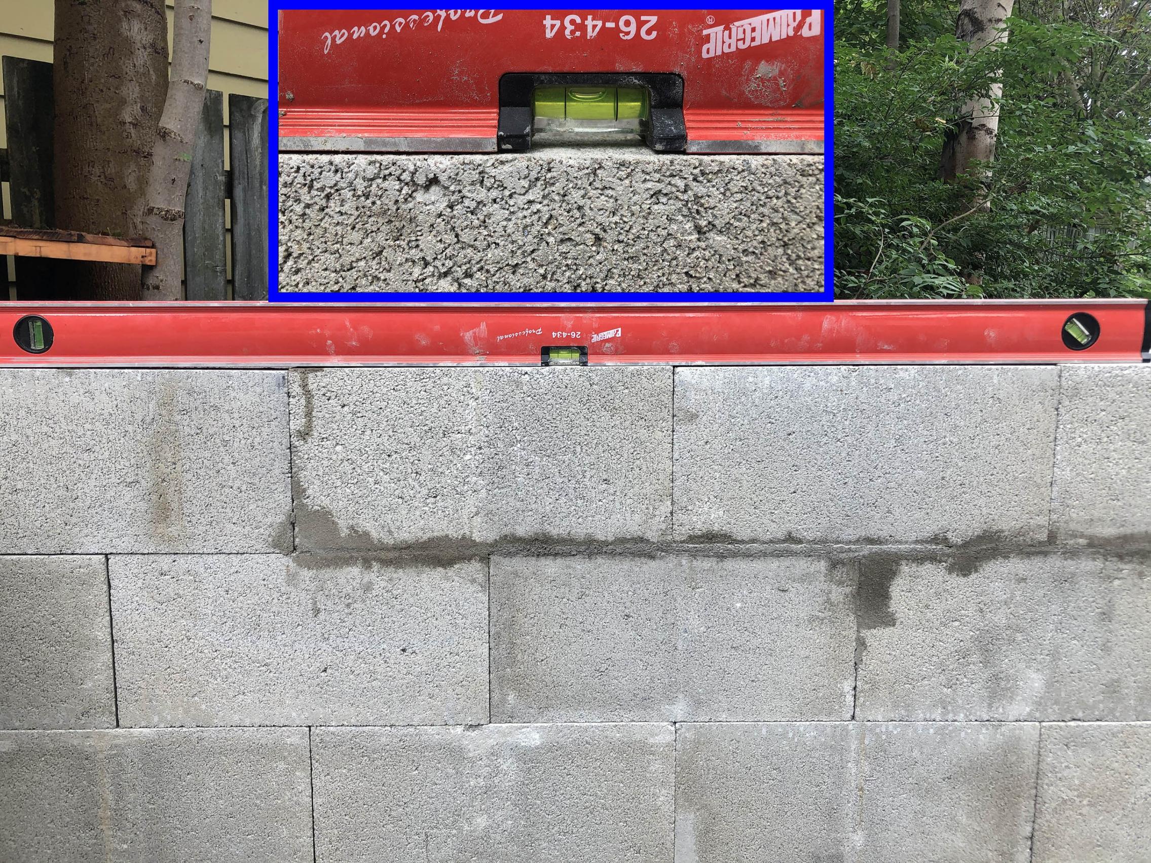 I recently stacked my stand and I had a conversation with a mason who recommended that I don't dry stack my blocks. Is what I have done is ok? The diagonals are equal. I used mortar on the bottom layer. I plan to fill cores with rebar. I have concerns about the "right wall.jpg"