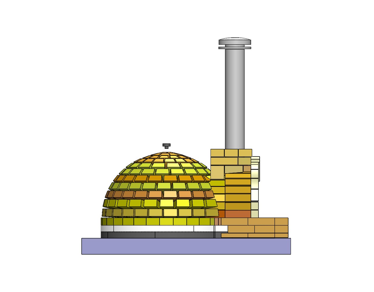 It looks like you have the 1-1/4" offset that Russell wrote of. That really is key to keeping the inside faces of the dome bricks flush with their neighbors with no offsetting lippage. And having the IT adjustable will help as you go vertical. Again, exactly what Russell wrote...any vertical distance between the IT hinge's center-of-rotation for its vertical rotation and the actual floor height of the dome floor brick will cause the dome height to increase by that same distance as the brick courses approach the apex of the dome. The adjustments required, if any, are quite small per course.